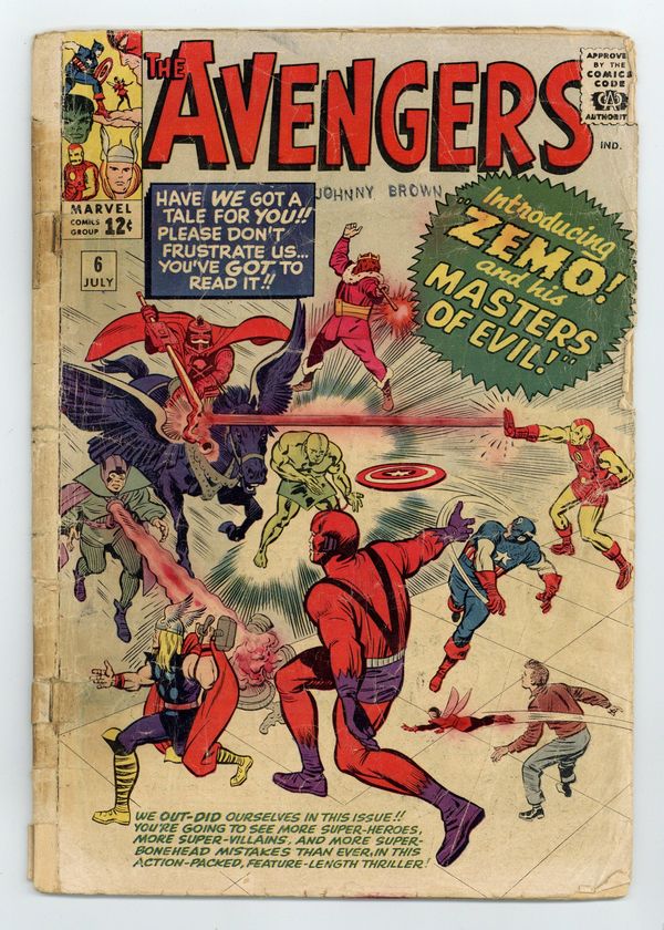 Cover pencils by Jack Kirby, inks by Chic Stone. First full appearance of Baron Zemo, and first appearance of the second Black Knight in "Masters of Evil!", script by Stan Lee, pencils by Jack Kirby, inks by Chic Stone; Baron Zemo, the man behind the cause of Bucky's death discovers that Captain America is still alive; Collecting together the Black Knight, Radioactive Man and the Melter, the Masters of Evil are formed; While the Masters of Evil spray the city with 'Adhesive X', a powerful glue for which there is no solvent, the Avengers attack; Captain America and Giant-Man get trapped by the adhesive and the Avengers withdraw to try and find a solution for it; Wasp remembers that a criminal behind bars called Paste-Pot Pete might be able to help; After receiving the solution they free Captain America and Giant-Man, and attack the Masters again. Special bonus: The letter column in this issue leads off with a letter from Buddy Saunders, the owner of MyComicShop. Oh, for the halcyon days of our callow youth! In the letter Buddy tells Stan and Jack that Avengers #4, with the return of Captain America, was one heck of a great issue. Time has certainly proven him right! 36 pgs., full color. $0.12. Cover price $0.12.