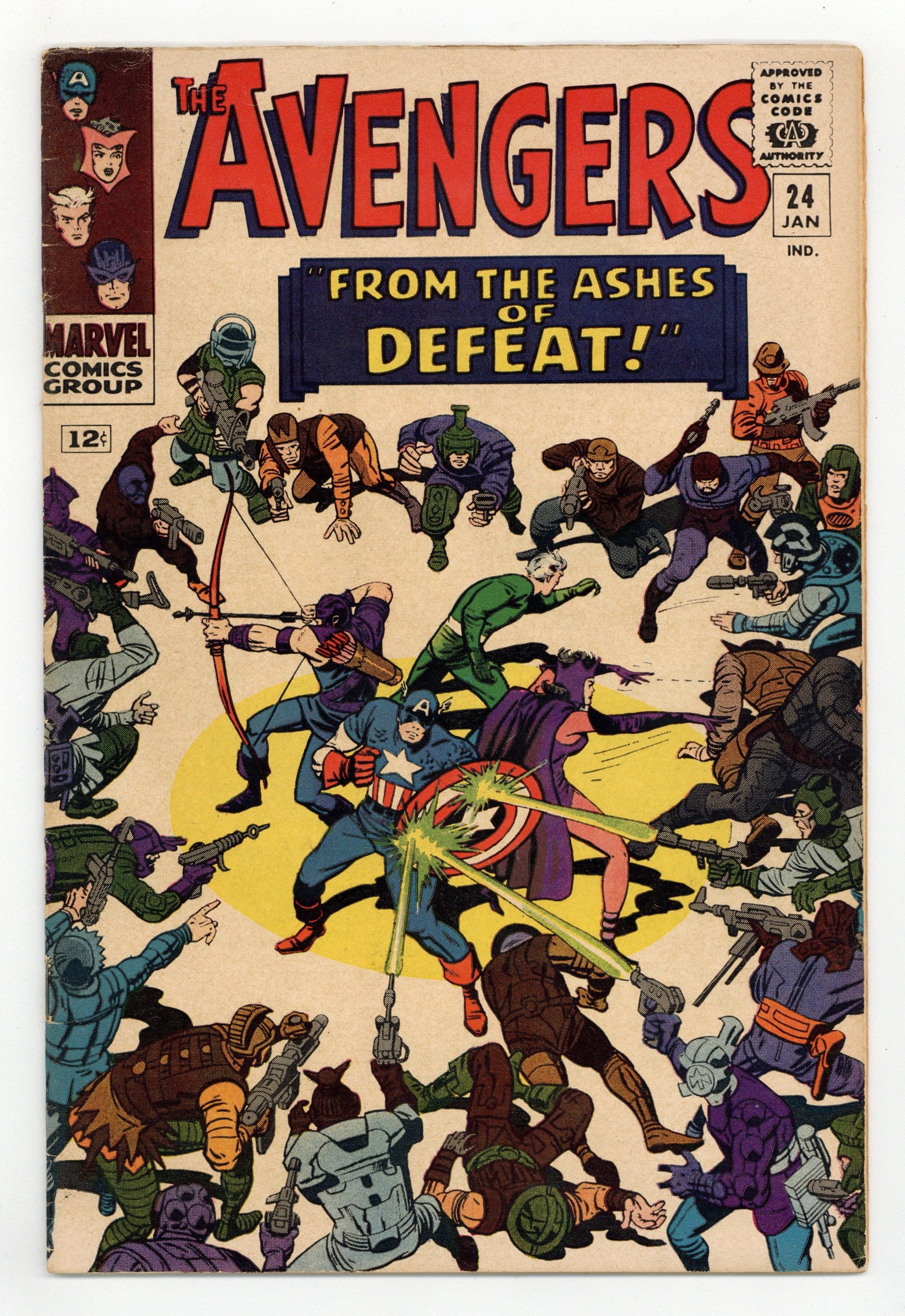 Starts Jan 3 Cover pencils by Jack Kirby, inks by Dick Ayers. "From the Ashes of Defeat - !", script by Stan Lee, pencils by Don Heck, inks by Dick Ayers; Kang's troops advance on the city as Kang escapes; Although hopeless, the Avengers decide to put up a fight against the never-ending army; Quicksilver is put out of action by a stray blast while trying to help a mother and child; The rest of the Avengers battle on but are eventually overwhelmed and captured; Although Kang's law states that monarchs conquered are to be executed, Kang wants to marry Ravonna; Meanwhile, Quicksilver is nursed back to health by the mother he saved; The rest of the generals led by Baltag rebel against Kang and try to assassinate him; Kang is then forced to team up with Captain America, Hawkeye and the Scarlet Witch to save Ravonna and liberate her civilization. Avengers Roll Call: Captain America, Hawkeye, Quicksilver, and the Scarlet Witch. Guest appearance by Princess Ravonna and Carelius. Reprinted in Marvel Triple Action #18. 36 pgs., full color. $0.12. Cover price $0.12.