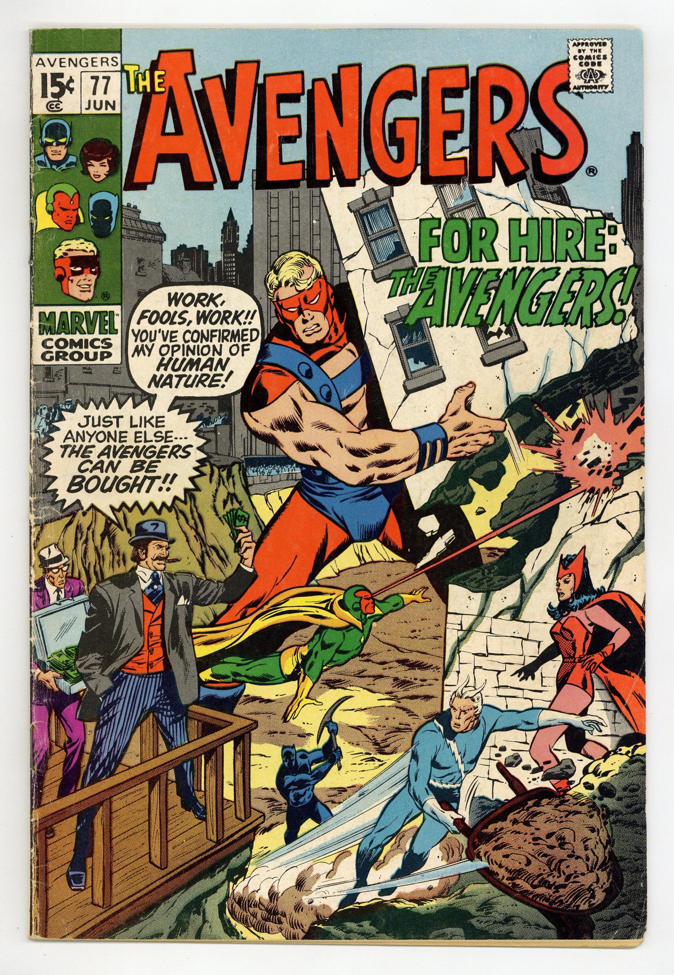 "Heroes for Hire!" Script by Roy Thomas. Pencils by John Buscema. Inks by Tom Palmer. Cover by John Buscema and Tom Palmer. Earth's Mightiest Heroes go to work! And unfortunately for the highest bidder Cornelius Van Lunt! Due to Stark Industries' financial woes caused by a hostile takeover attempt (by the aforementioned Mr. Van Lunt), the Avengers must come up with the back rent long overdue on their Fifth Avenue Mansion! So now it's time to punch the clock! But after completing their first paid assignment; Pietro and T'Challa sense that something isn't quite right about their working arrangement with Mr. Van Lunt! Are Earth's Mightiest Heroes going to walk off the job? Not until they put the Split-Second Squad out of business! First appearance of the Split-Second Squad. Cameo appearance by Johnny Carson. Flashback cameo by Tony Stark. Avengers Lineup: Black Panther, Goliath, Quicksilver, Scarlet Witch, and the Vision. 36 pages. Cover price $0.15.