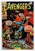 "The Sword and the Sorceress!" Script by Roy Thomas. Pencils by John Buscema. Inks by Tom Palmer. Cover by John Buscema and Sal Buscema. The beleaguered Black Knight journeys to the world of Polemachus to solve the mystery of his bloodthirsty ebony blade! However, Dane Whitman doesn't know who rules this extra-dimensional planet! Arkon the Magnificent! And the Imperion has a new ally on his home world: the Enchantress! That can't be good for Earth's Mightiest Heroes! And it's not once Arkon captures the knight, and the enchanting Asgardian teleports Wanda, Pietro, Goliath, and the Vision to Polemachus! But back on Earth, the Black Panther enlists the aid of the thunder god; and shortly thereafter all parties are on Polemachus and ready to rumble! The Avengers vs. Arkon and the Enchantress! A marvelous matchup indeed! Flashback cameo by the sixth century Black Knight (aka Sir Percy of Scandia). Avengers Lineup: Black Knight, Black Panther, Goliath, Quicksilver, Scarlet Witch, Thor, and the Vision. (Notes: Arkon returns in Fantastic Four 160. The letters page includes a letter from comics writer Mike Barr.) 36 pages. Cover price $0.15.