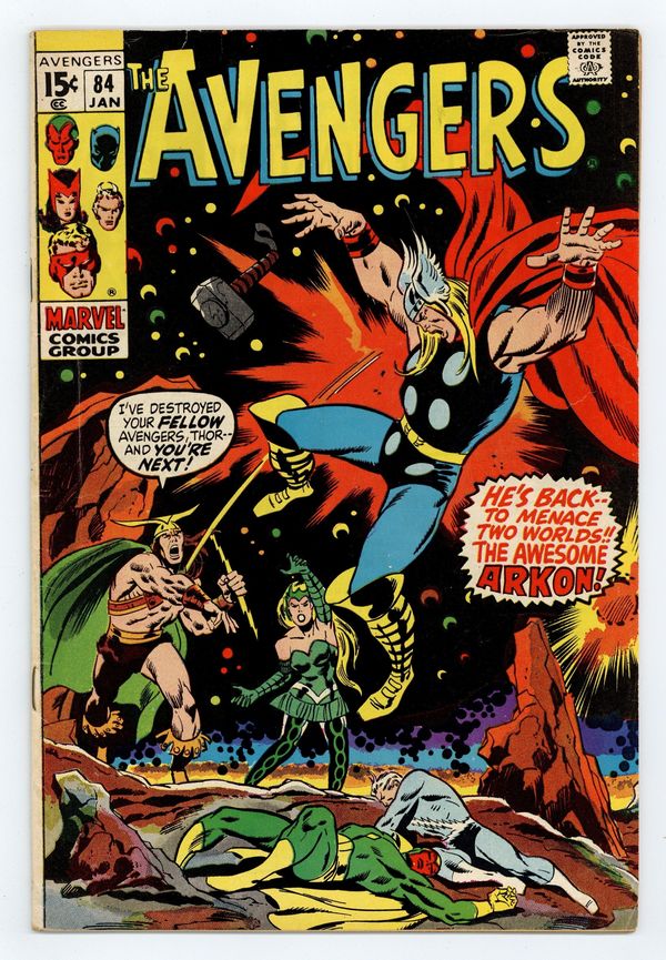 Tags: Marvel Legacy Numbering: Avengers (part 84), Avengers$14.25"The Sword and the Sorceress!" Script by Roy Thomas. Pencils by John Buscema. Inks by Tom Palmer. Cover by John Buscema and Sal Buscema. The beleaguered Black Knight journeys to the world of Polemachus to solve the mystery of his bloodthirsty ebony blade! However, Dane Whitman doesn't know who rules this extra-dimensional planet! Arkon the Magnificent! And the Imperion has a new ally on his home world: the Enchantress! That can't be good for Earth's Mightiest Heroes! And it's not once Arkon captures the knight, and the enchanting Asgardian teleports Wanda, Pietro, Goliath, and the Vision to Polemachus! But back on Earth, the Black Panther enlists the aid of the thunder god; and shortly thereafter all parties are on Polemachus and ready to rumble! The Avengers vs. Arkon and the Enchantress! A marvelous matchup indeed! Flashback cameo by the sixth century Black Knight (aka Sir Percy of Scandia). Avengers Lineup: Black Knight, Black Panther, Goliath, Quicksilver, Scarlet Witch, Thor, and the Vision. (Notes: Arkon returns in Fantastic Four 160. The letters page includes a letter from comics writer Mike Barr.) 36 pages. Cover price $0.15.
