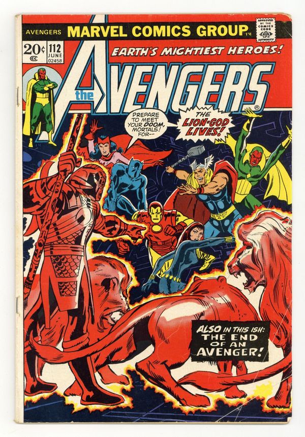 Tags: Marvel Legacy Numbering: Avengers (part 112), Avengers$39.00"The Lion God Lives!" First appearance of Mantis. Script by Steve Englehart. Pencils by Don Heck. Inks by Frank Rolle. Cover by Don Heck. A mob of African protesters gathers outside Avengers Mansion and demands that the Black Panther return to his native Wakanda! When T'Challa goes outside to talk, he's kidnapped by their leader, the Lion God! Then the mob disperses and the Avengers are left wondering what just happened! However several hours later, the Lion God returns to the mansion and the no-holds-barred battle begins! Unfortunately, Earth's Mightiest Heroes fall one-by-one until only the Avengers' resident god remains! Can the Mighty Thor bring down the thunder and lightning and silence the Lion God's roar? Meanwhile on the other side of the globe, a mysterious couple makes plans to travel to the United States and join the Avengers. Cameo appearances by Mantis and the Swordsman. Avengers Lineup: Black Panther, Black Widow, Captain America, Iron Man, Scarlet Witch, Thor, and the Vision. 36 pages Cover price $0.20.