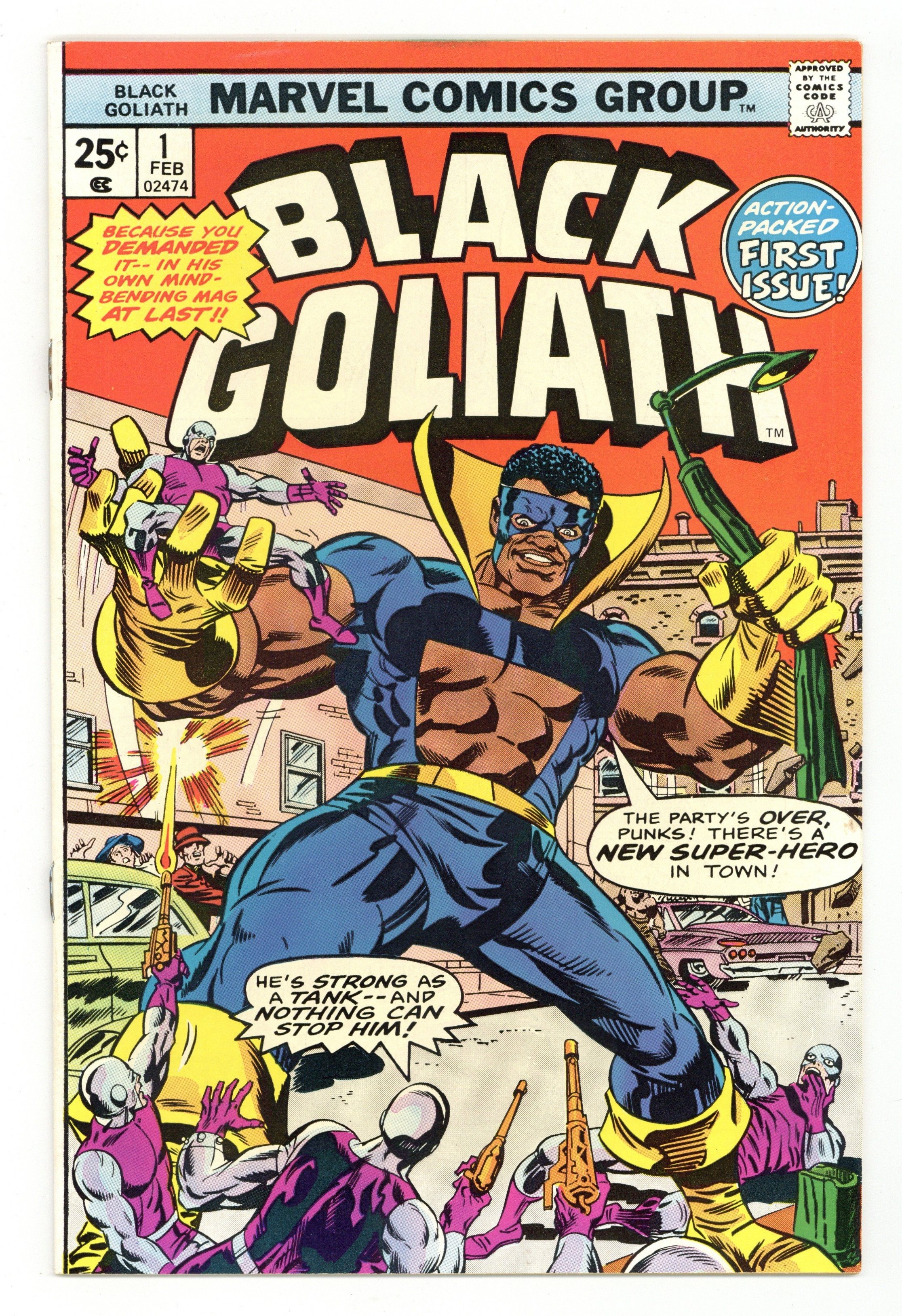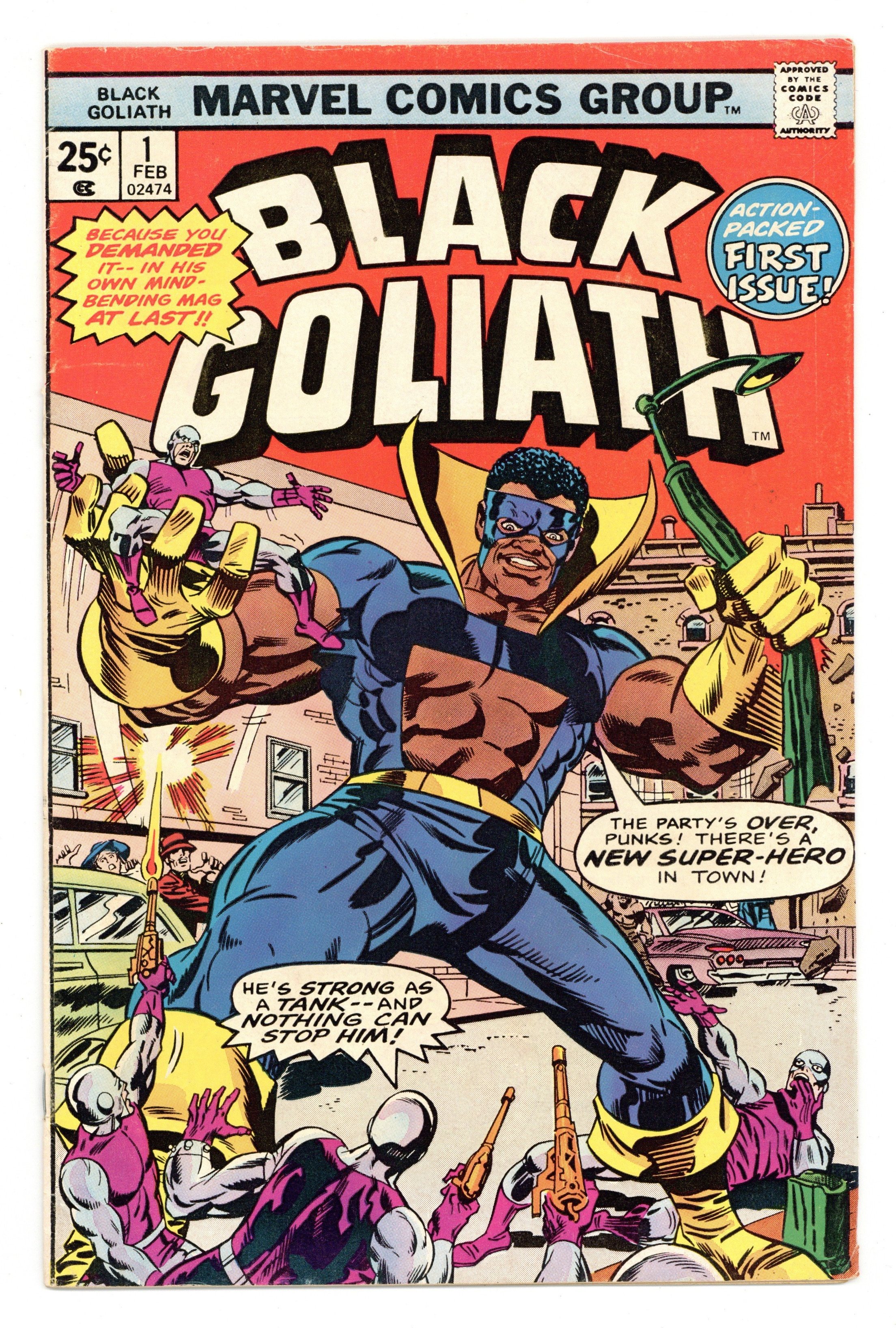 Ends Mar 9 7:39 PM CST Bid History 14 bids Current Bid $57 Your Secret Max Bid If you'd like to bid, please log in or register. Cover art by Ron Wilson and Frank Giacoia. Origin of Black Goliath in "Black Goliath." Black Goliath, script by Tony Isabella, pencils by George Tuska, inks by Vince Colletta; Bill Foster establishes himself in Los Angeles, leading a research team for Stark Industries; As Black Goliath he investigates a series of radium robberies and finds Atom-Smasher and his gang; Guest appearance by Hank and Janet Pym; Tony Stark (Iron Man) and Luke Cage cameos. Black Goliath's first appearance is in Luke Cage, Power Man 24. The story here continues in issue 25. Spider-Man stars in a one-page Hostess ad, The Kidnap Caper. Advertisement for the record album "Reflections of a Super-Hero!" narrated by Stan Lee. 36 pgs. $0.25. Cover price $0.25.