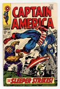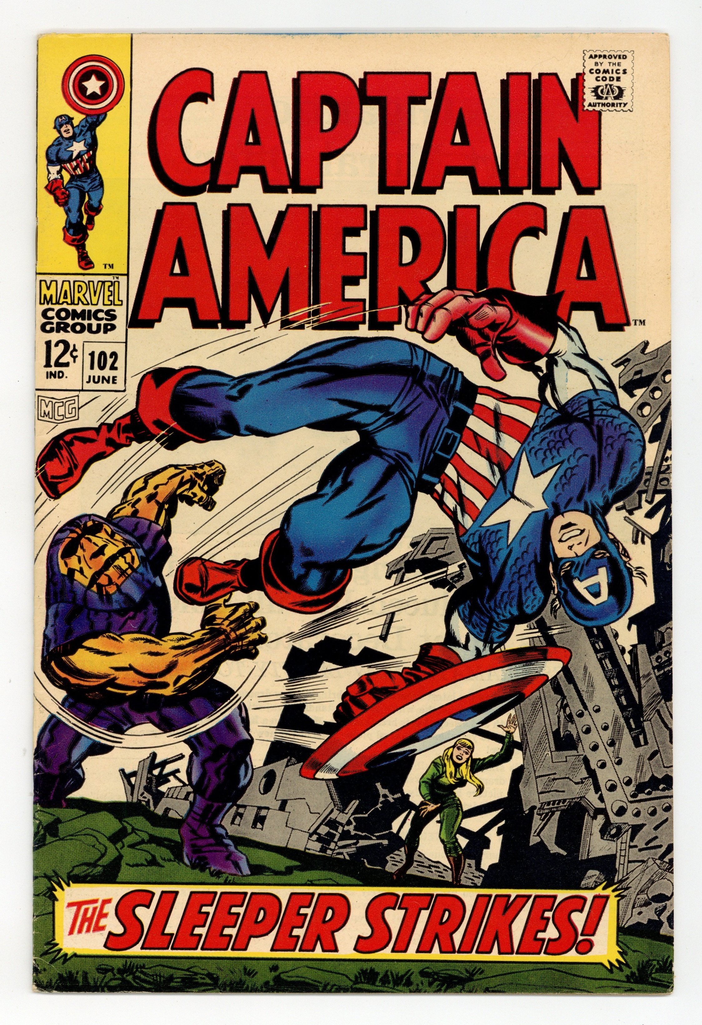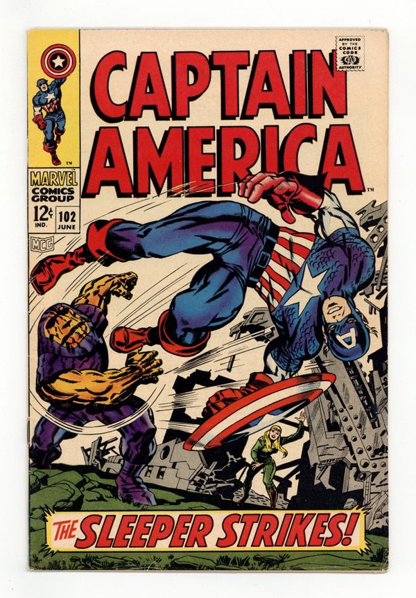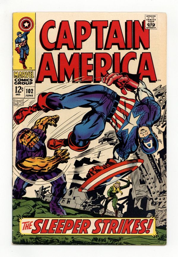 Tags: Marvel Legacy Numbering: Captain America (part 102), Captain America$19.50Cover pencils by Jack Kirby, inks by Syd Shores. "The Sleeper Strikes!", script by Stan Lee, pencils by Jack Kirby, inks by Syd Shores; The Red Skull has awakened a fourth Sleeper robot , which is destroying strategic U.S. locations with its power blasts; Cap and Agent 13 try to track the Sleeper on its path of destruction; The Red Skull sends his henchman to try and prevent the heroes from destroying the robot; Cap battles the robot. Brief Nick Fury appearance. Marvel Super-Hero T-Shirts ad. Letter to the editor from comics writer Doug Moench. Ad for Doctor Strange and Nick Fury, Agent of S.H.I.E.L.D. 36 pgs., full color. $0.12. Cover price $0.12.