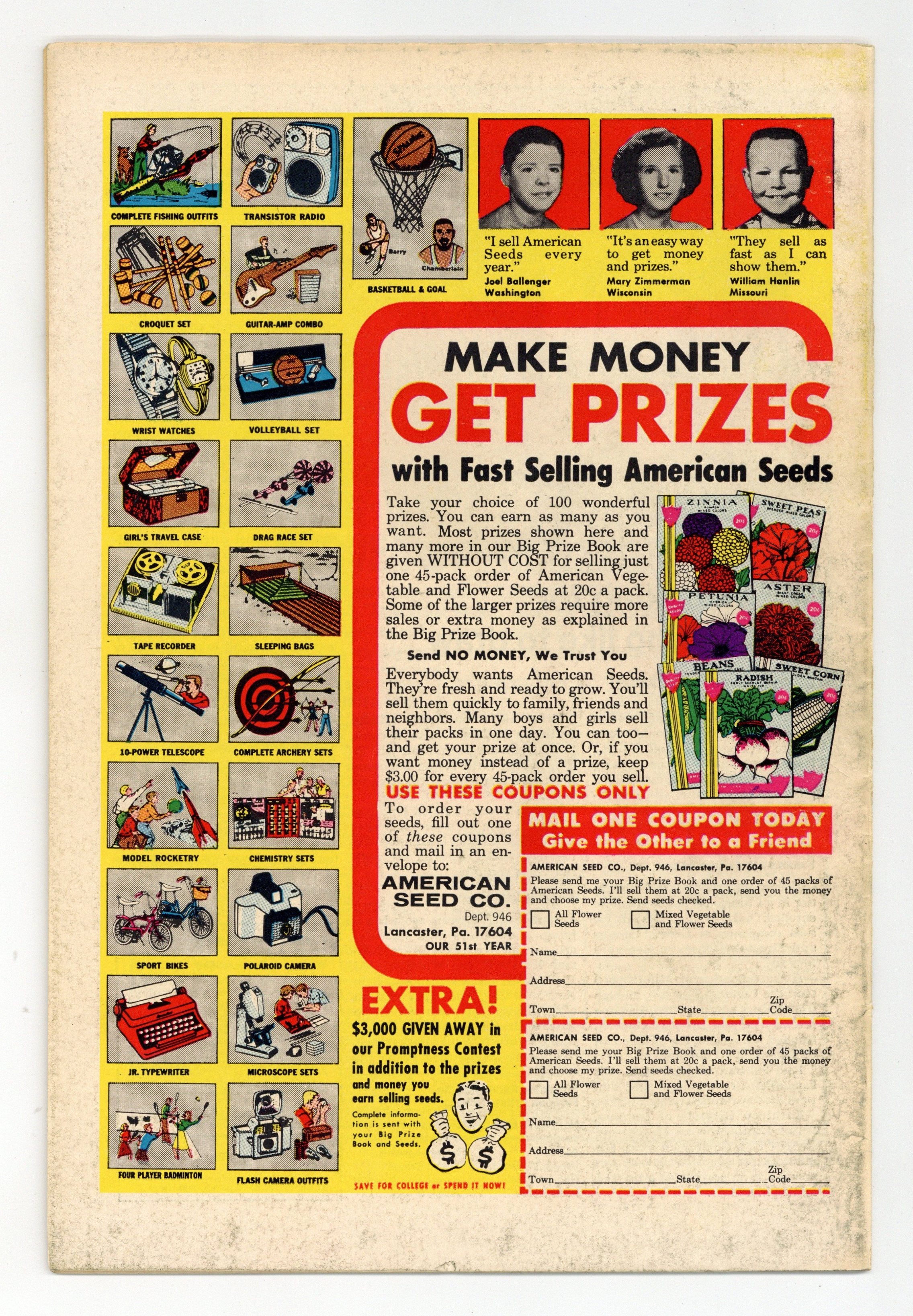 Cover by John Romita. The Avengers have a cameo in "The Man Behind the Mask!", script by Stan Lee, pencils by John Romita and Sal Buscema, inks by Sal Buscema; After convincing the American public that Steve Rogers was a fake identity, Captain American walks around in Manhattan, contemplating on what to do with his life; He realizes he is more Cap than Steve, and decides make a more normal life for himself instead of being an Avenger; Even so, Captain America and Rick Jones rescue Sharon Carter; The Red Skull shows Captain America that he has recovered the Cosmic Cube. 36 pgs., full color. $0.12. Cover price $0.12.