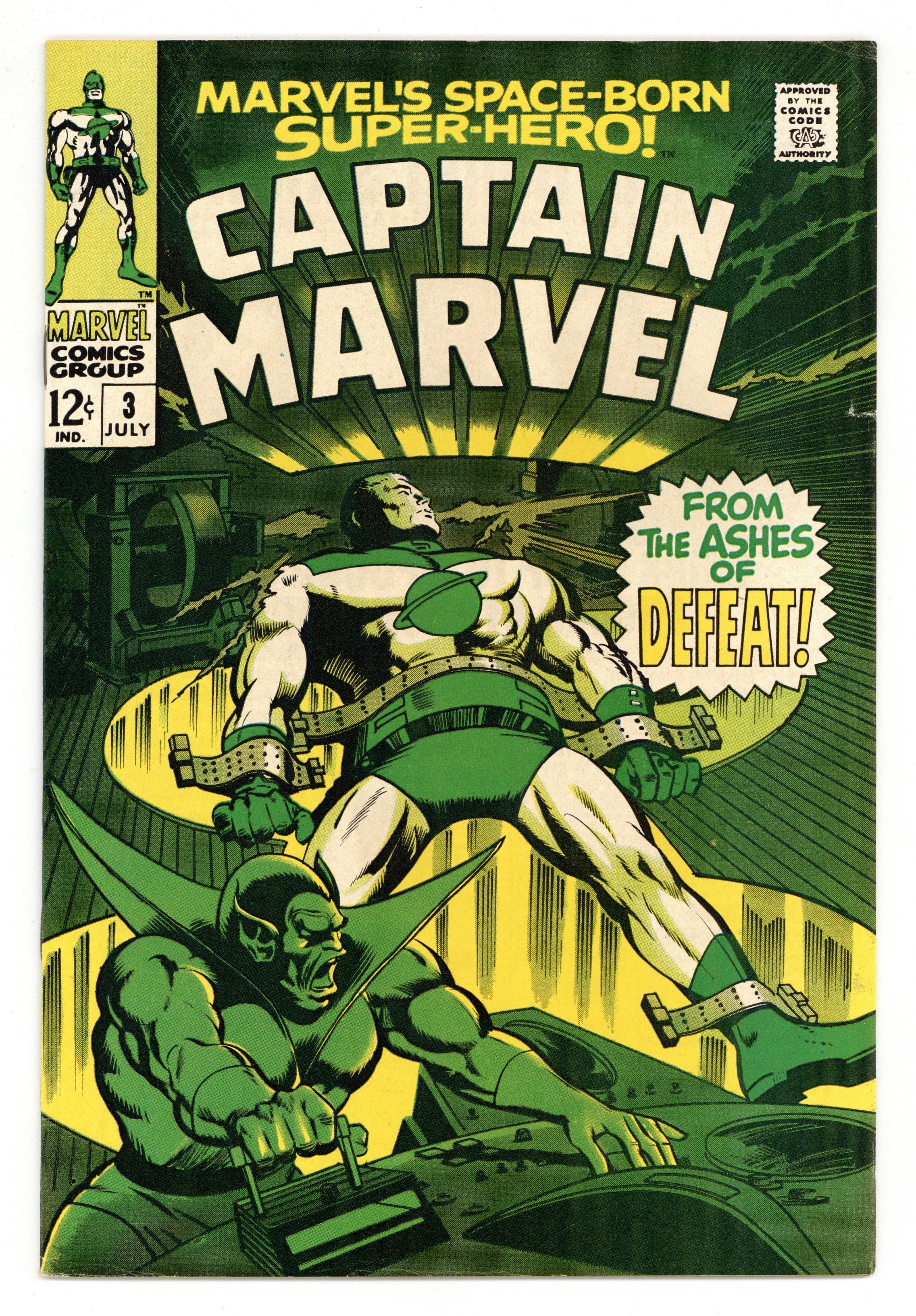 $20.50Cover pencils by Gene Colan, inks by Vince Colletta. "From the Ashes of Defeat!", script by Roy Thomas, pencils by Gene Colan and Roy Thomas (zip-a-tone effects), inks by Vince Colletta and Roy Thomas; Captain Marvel is now the prisoner of the Super-Skrull, who takes Mar-Vell aboard his ship in order to probe his mind and learn why the Kree are so interested in the planet Earth; In doing so he learns about Mar-Vell's mission and his recent battle against the Kree Sentry, his identity as Walter Lawson, and his carrying case with the self-destruct mechanism; Mar-Vell manages to break free and escape the Super-Skrull's ship and return to his own ship; There when Yon-Rogg refuses to grant Mar-Vell permission to go back to Earth and stop the Super-Skrull and save the Earth from nuclear holocaust, Mar-Vell petitions the Imperial Minister, who allows Mar-Vell to go back to Earth, more to get revenge on the Skrull who defeated him than to save Earth; Mar-Vell arrives just in time to see the Super-Skrull (disguised as Lawson) enter the Cape with the carrying case. Missive from letter hack Guy Lillian III. 36 pgs., full color. Cover price $0.12.