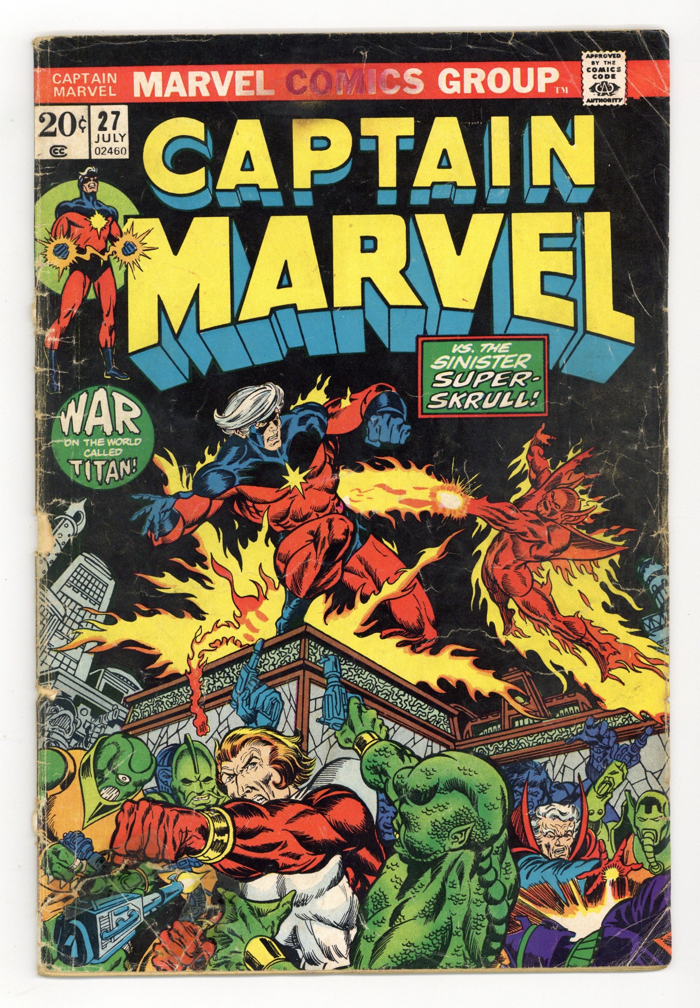The Super-Skrull continues to pester Captain Marvel in "Trapped on Titan!" Script by Mike Friedrich, plot and pencils by Jim Starlin, inks by Pablo Marcos. Meanwhile, Thanos seeks out the Cosmic Cube. Cameos by the Thing (of the Fantastic Four), the Avengers (Captain America, Iron Man, the Scarlet Witch, the Vision, and the Black Panther), and Drax the Destroyer. This issue also contains a map of Titan. Cover price $0.20.