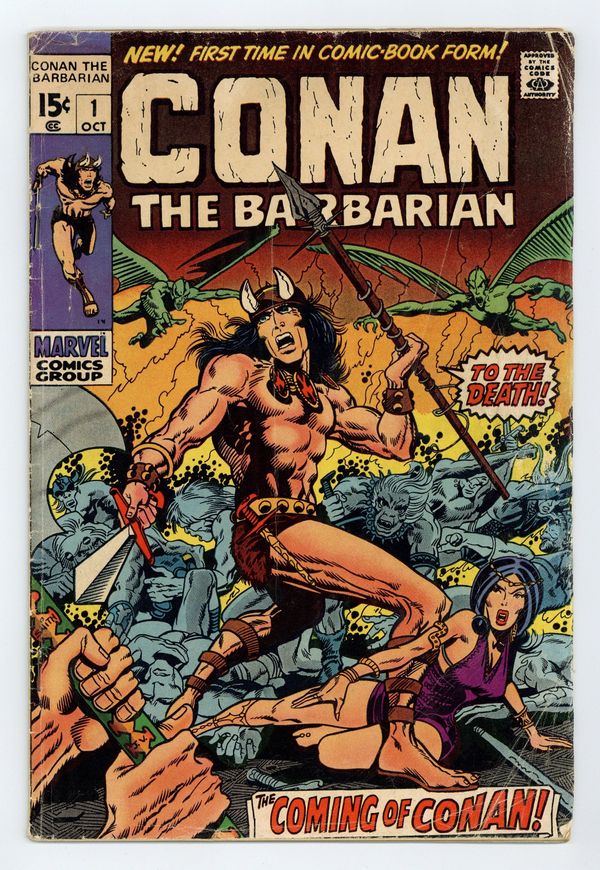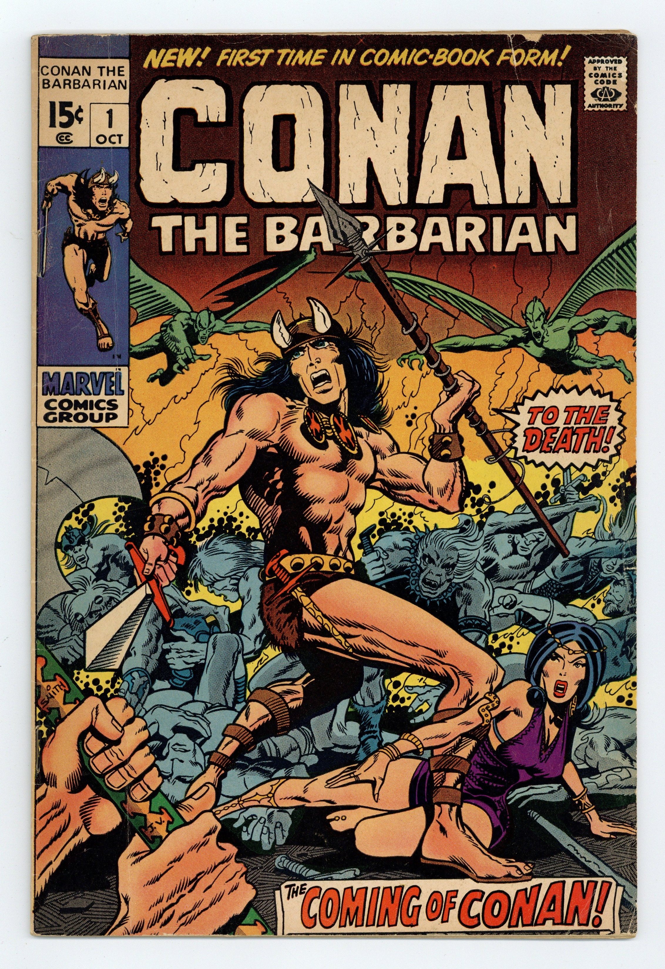 Cover pencils by Barry Windsor-Smith, inks by John Verpoorten. First comic book appearance and origin of Conan. The Coming of Conan!, script by Roy Thomas, pencils by Barry Windsor-Smith, inks by Dan Adkins; Conan battles at Vanaheim and sees his future; Tara returns to her dimension 1st comic book appearance of Kull (cameo). The letters page contains a map of Conan's world of the Hyborian Age drawn by Windsor-Smith (based on Robert E. Howard's own version) and a short essay on The World of Conan. 36 pgs. Cover price: $0.15. Cover price $0.15.