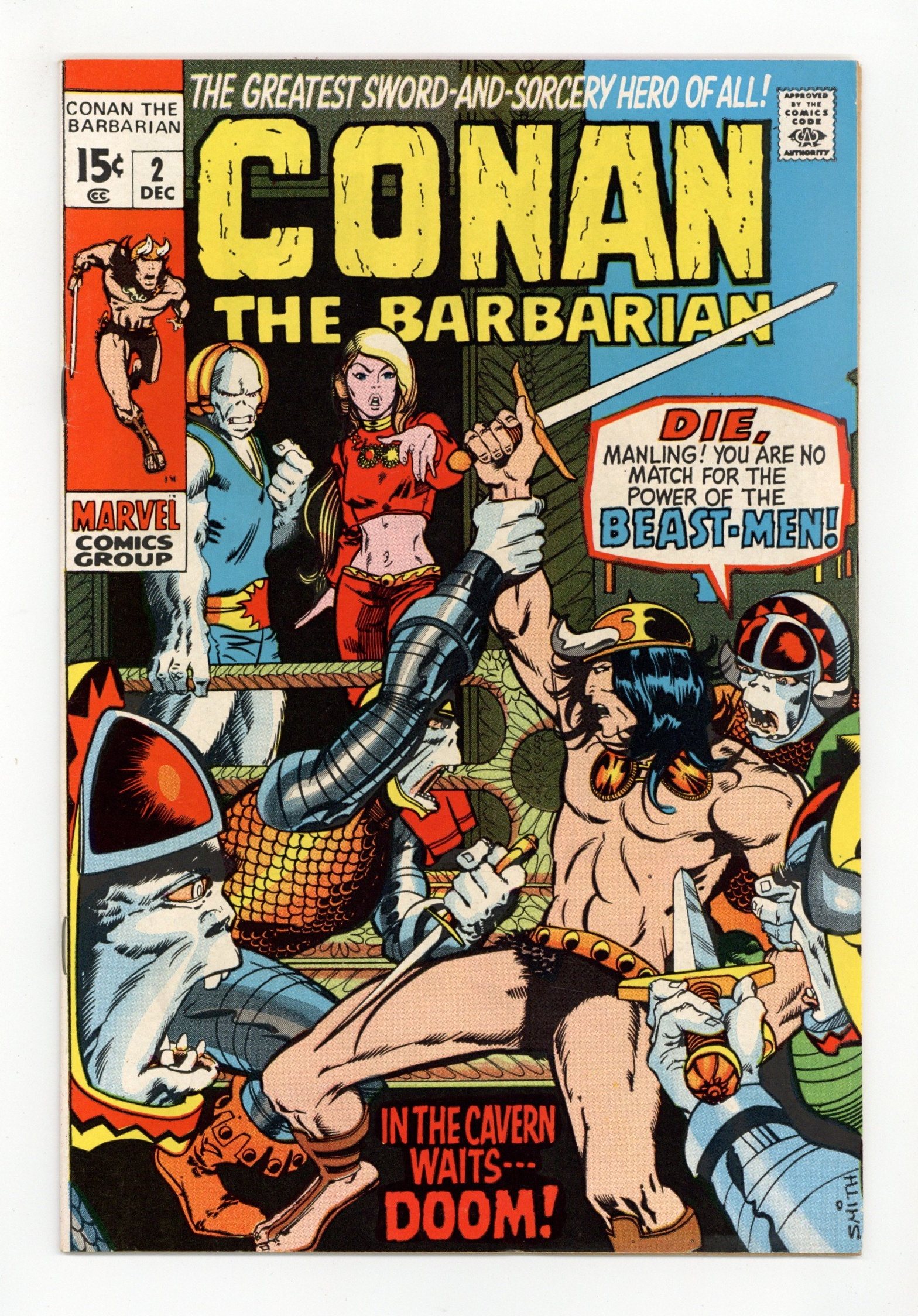 Cover art by Barry Windsor-Smith. Lair of the Beast-Men!, script by Roy Thomas, pencils by Barry Windsor-Smith, inks by Sal Buscema; Conan leads humans in a revolution against their ape-masters; Conan kills a snow-lion; Conan's 1st time in chains. Letters to the editor from writers Harlan Ellison, Dick Lupoff, August Derleth, and Ted White; comics historians Don and Maggie Thompson; and Glenn Lord. The letters page reprints the Hyborian Age map from Conan 1. 36 pgs. Cover price: $0.15. Cover price $0.15.