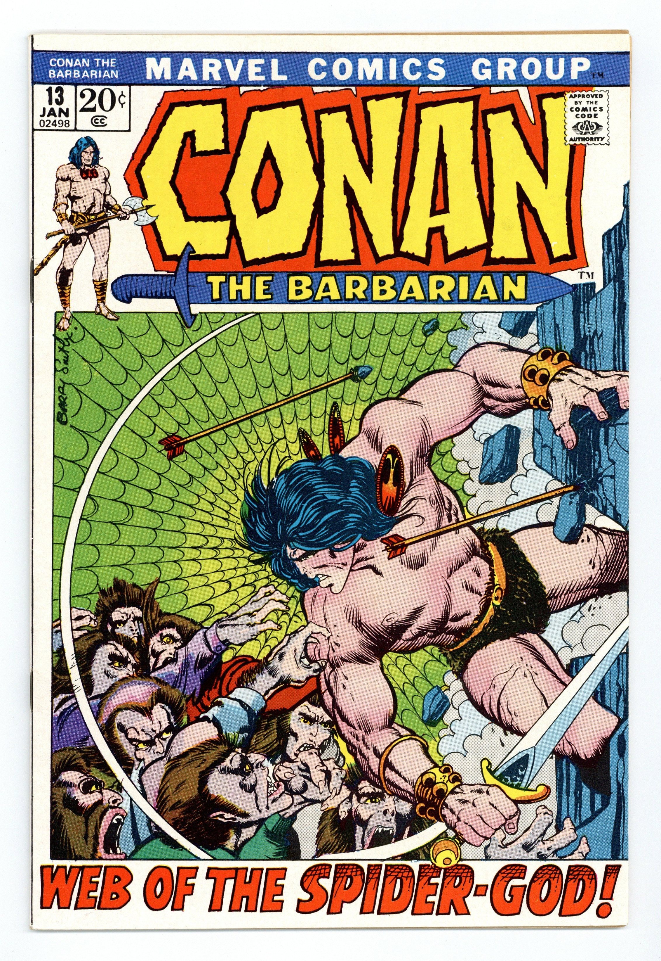 Cover art by Barry Windsor-Smith. Web of the Spider-God, plot by John Jakes, script by Roy Thomas, pencils by Barry Windsor-Smith, inks by Sal Buscema; setting: desert east of Ophir & city of Yezud; Conan is delirous in desert, Thanix saves his life; Conan fights Omm (giant spider), Tork destroys Yezud and leaves for Shadizar with Lea. 36 pgs. Cover price: $0.20. Cover price $0.20.