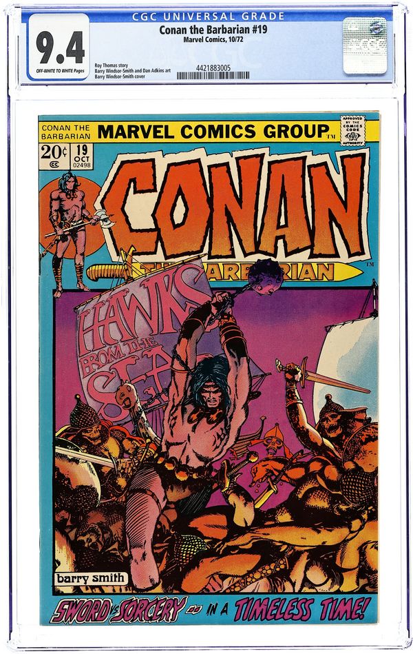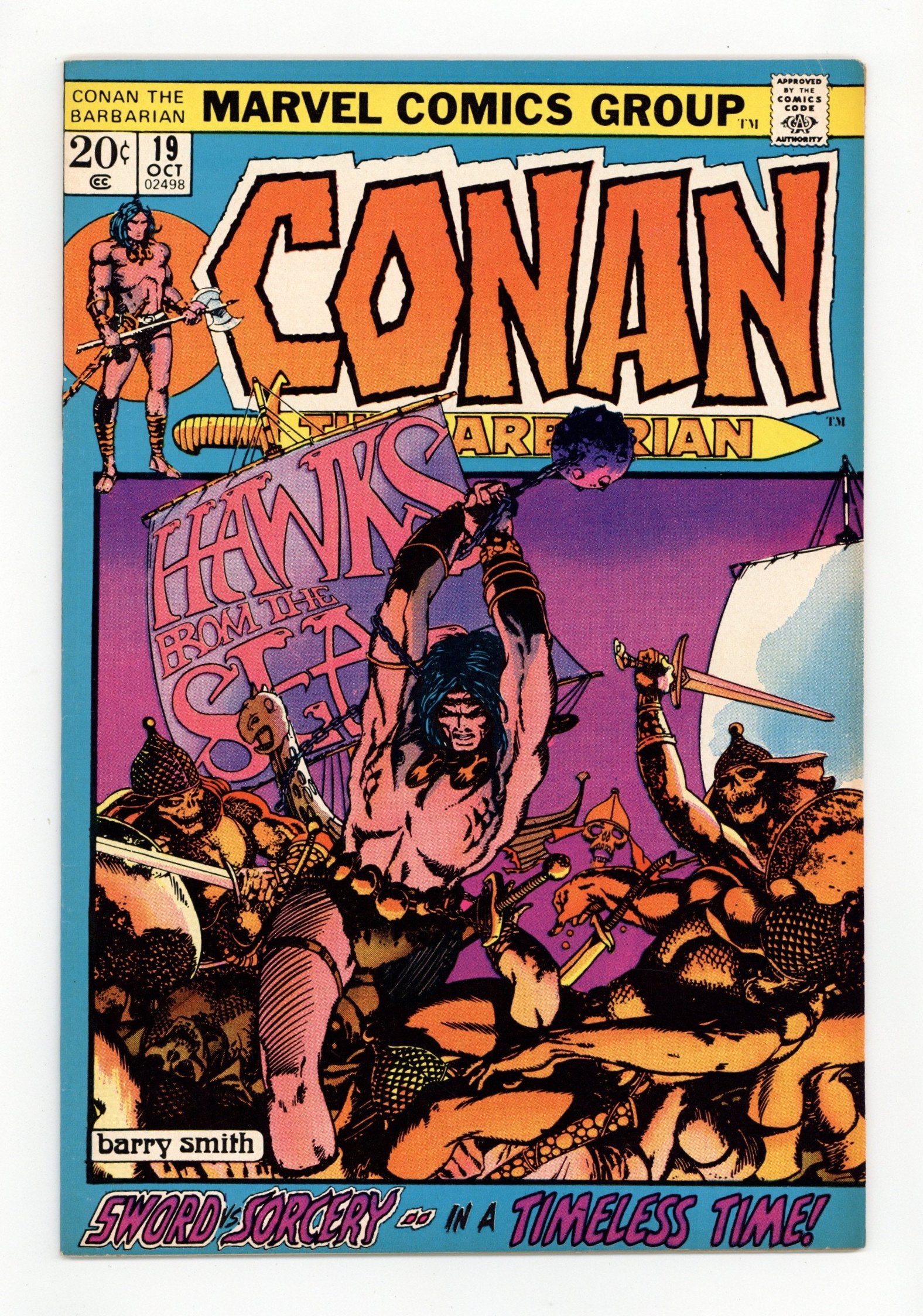 Cover art by Barry Windsor-Smith. Hawks From the Sea, script by Roy Thomas, pencils by Barry Windsor-Smith, inks (pages 1-9) by Dan Adkins. (Pages 10-20 were reproduced directly from the pencils); setting: Ship, City of Makkalet; Conan works for Turanian military and lays seige to Makkalet; Legend of the Living Tarim is told; Conan makes enemy of Balthaz; Fafnir is wounded by flaming arrow. 36 pgs. Cover price $0.20. Cover price $0.20.