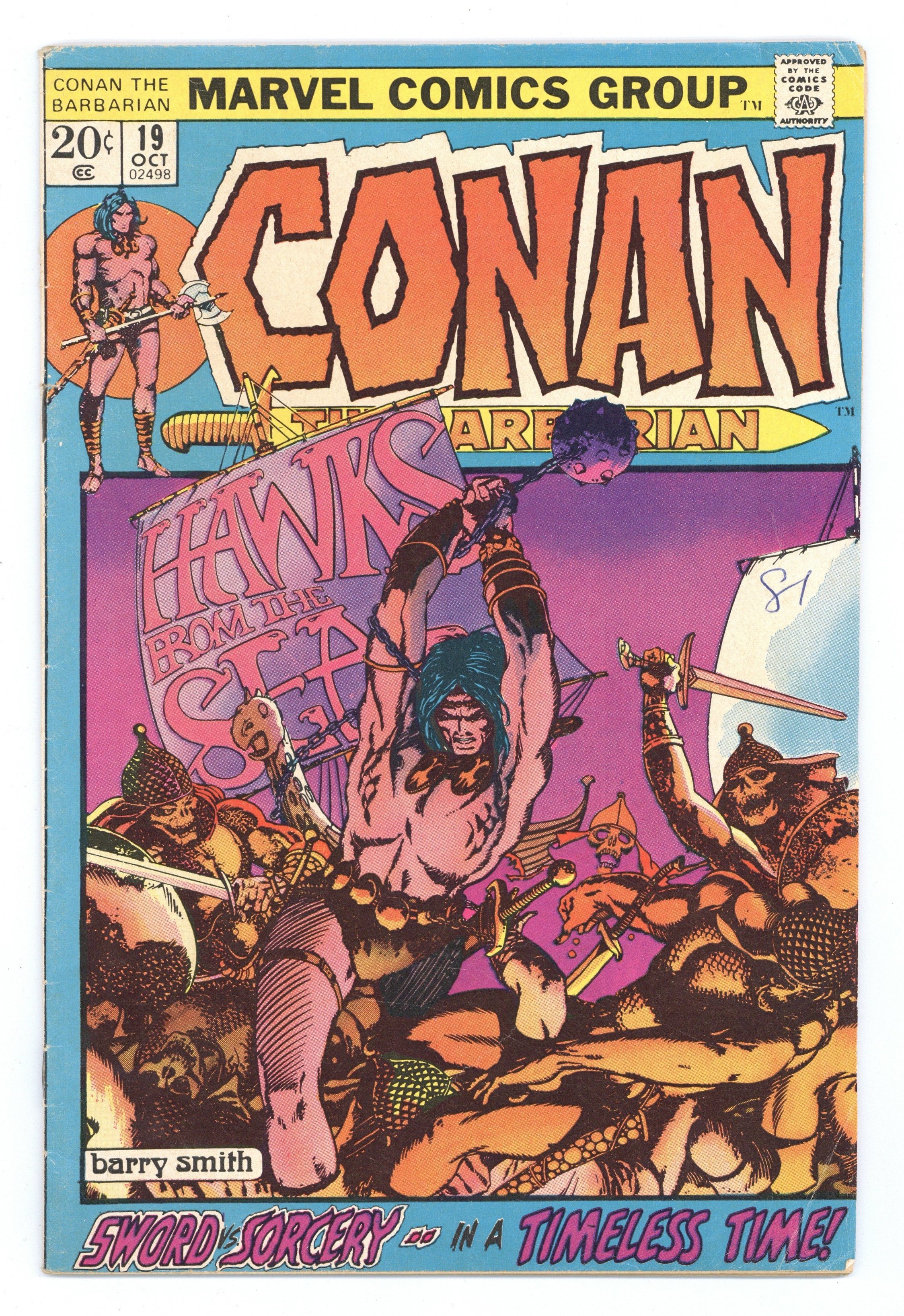 Tags: Marvel Legacy Numbering: Conan (part 19), Conan$9.30Cover art by Barry Windsor-Smith. Hawks From the Sea, script by Roy Thomas, pencils by Barry Windsor-Smith, inks (pages 1-9) by Dan Adkins. (Pages 10-20 were reproduced directly from the pencils); setting: Ship, City of Makkalet; Conan works for Turanian military and lays seige to Makkalet; Legend of the Living Tarim is told; Conan makes enemy of Balthaz; Fafnir is wounded by flaming arrow. 36 pgs. Cover price $0.20. Cover price $0.20.