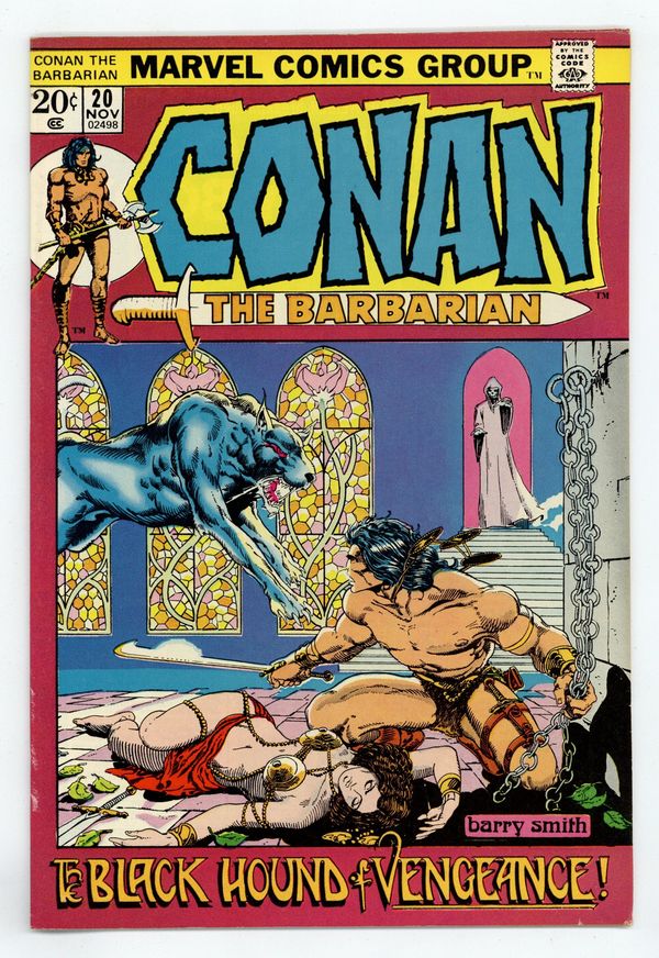 Tags: Marvel Legacy Numbering: Conan (part 20), Conan$17.00Cover art by Barry Windsor-Smith. The Black Hound of Vengeance, script by Roy Thomas, pencils by Barry Windsor-Smith, inks by Dan Adkins; setting: Ship, City of Makkalet; Fafnir loses his arm and is thrown overboard by Balthaz to drown; Conan infiltrates the Temple of Tarim and kills a black hound; Conan kills Balthaz and flees Yezdigerd's ship. The letters page reprints the Hyborian Age map from Conan 1. The page also announces the winners of the 1971 Academy of Comic Book Arts. (Best Continuing Feature, Conan the Barbarian; Best Individual Story, "Snowbirds Don't Fly" by Denny O'Neil and Neal Adams from Green Lantern 85; Best Dramatic Penciler, Neal Adams; Best Dramatic Inker, Dick Giordano; Best Writer, Roy Thomas.) 36 pgs. Cover price $0.20. Cover price $0.20.