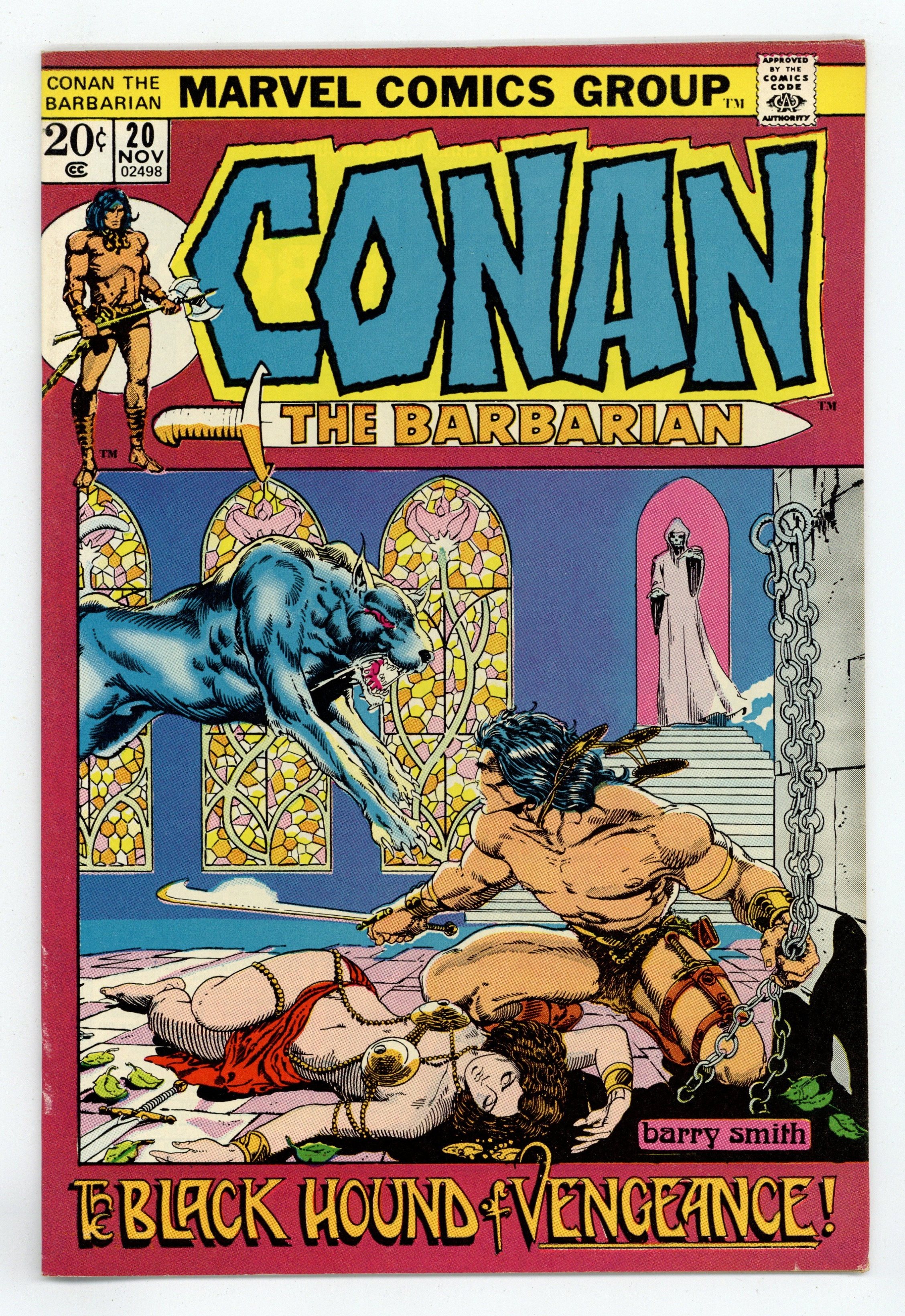 Cover art by Barry Windsor-Smith. The Black Hound of Vengeance, script by Roy Thomas, pencils by Barry Windsor-Smith, inks by Dan Adkins; setting: Ship, City of Makkalet; Fafnir loses his arm and is thrown overboard by Balthaz to drown; Conan infiltrates the Temple of Tarim and kills a black hound; Conan kills Balthaz and flees Yezdigerd's ship. The letters page reprints the Hyborian Age map from Conan 1. The page also announces the winners of the 1971 Academy of Comic Book Arts. (Best Continuing Feature, Conan the Barbarian; Best Individual Story, "Snowbirds Don't Fly" by Denny O'Neil and Neal Adams from Green Lantern 85; Best Dramatic Penciler, Neal Adams; Best Dramatic Inker, Dick Giordano; Best Writer, Roy Thomas.) 36 pgs. Cover price $0.20. Cover price $0.20.