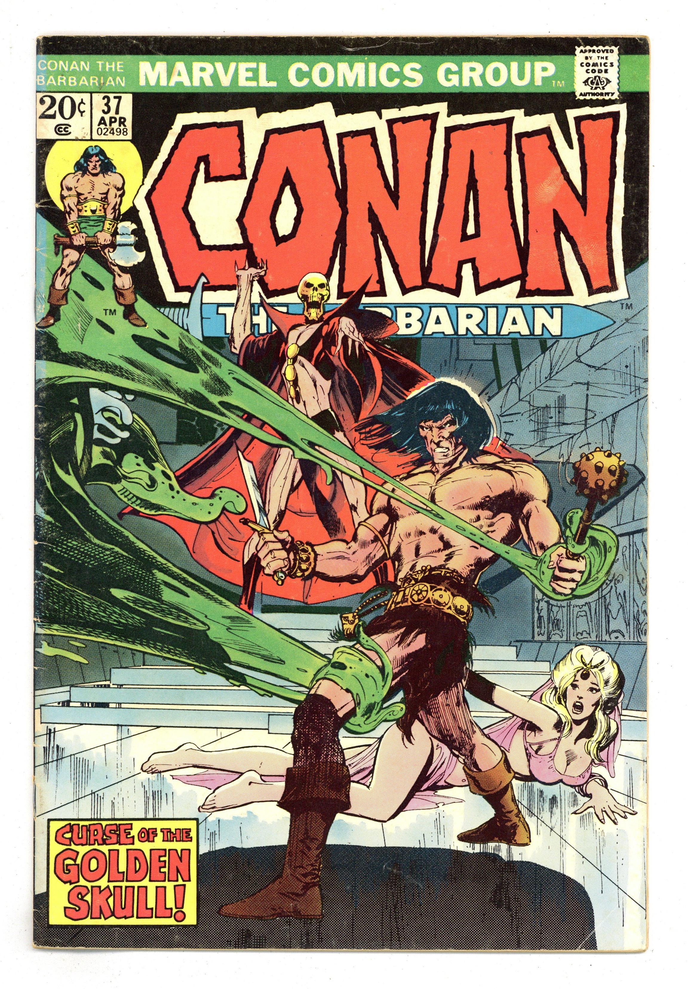 Tags: Marvel Legacy Numbering: Conan (part 37), Conan$8.50Last 20-cent issue. Cover art by Neal Adams. The Curse of the Golden Skull, script by Roy Thomas, art by Neal Adams; setting: Northen wastes of the Hill-men & city with crystal tower; Conan & Juma fight a giant slug & rescue Yolinda from Rotath; 3-page prologue introduces Rotath; adapted from the non-Conan story by Robert E. Howard. First comic book appearance of Juma, a character by Lin Carter and L. Sprague De Camp. The letters page contains Marvel Value Stamp Series A # 8 (Captain America by Buscema). 36 pgs. Cover price $0.20. Cover price $0.20.