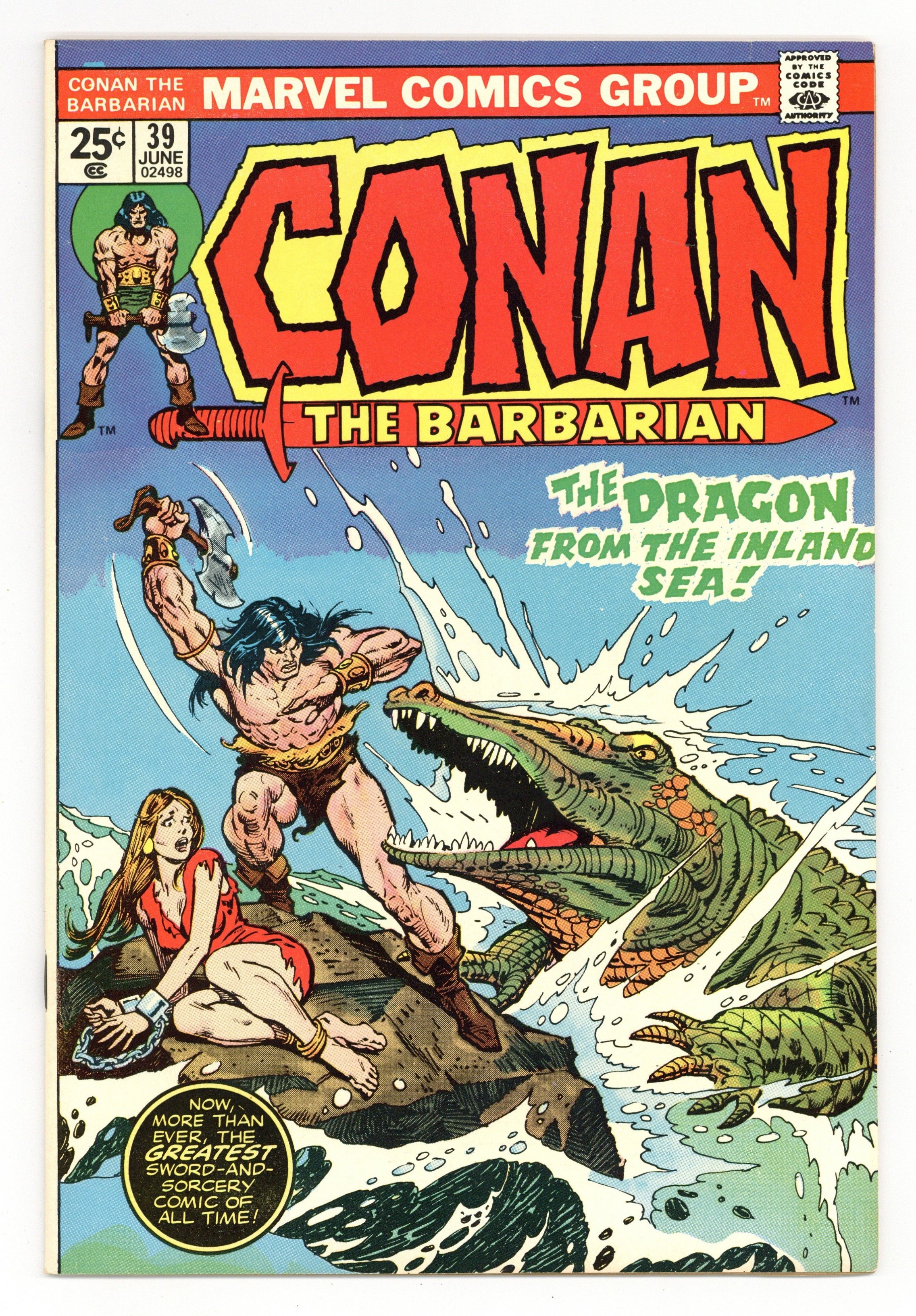 Tags: Marvel Legacy Numbering: Conan (part 39), Conan$10.00Cover pencils by Gil Kane, inks by Ernie Chan. The Dragon from the Inland Sea, script by Roy Thomas, art by John Buscema; setting: Desert & city of Keshaan; Conan defeats a crocodile-dragon, saves Rachella and restores Ben-Hussal as ruler of Keshaan. The letters page contains Marvel Value Stamp Series A # 72 (the Lizard). 36 pgs. Cover price $0.25.