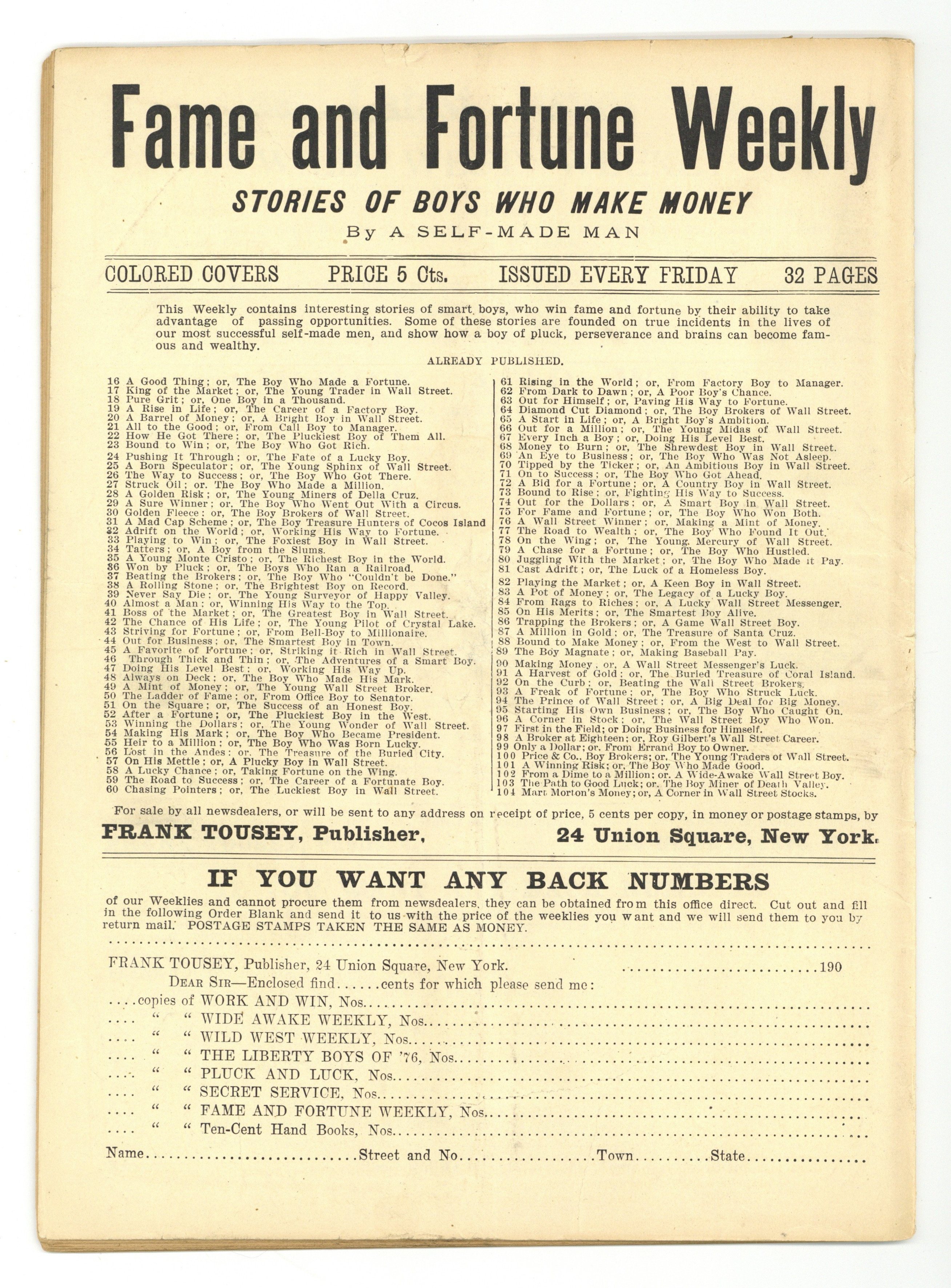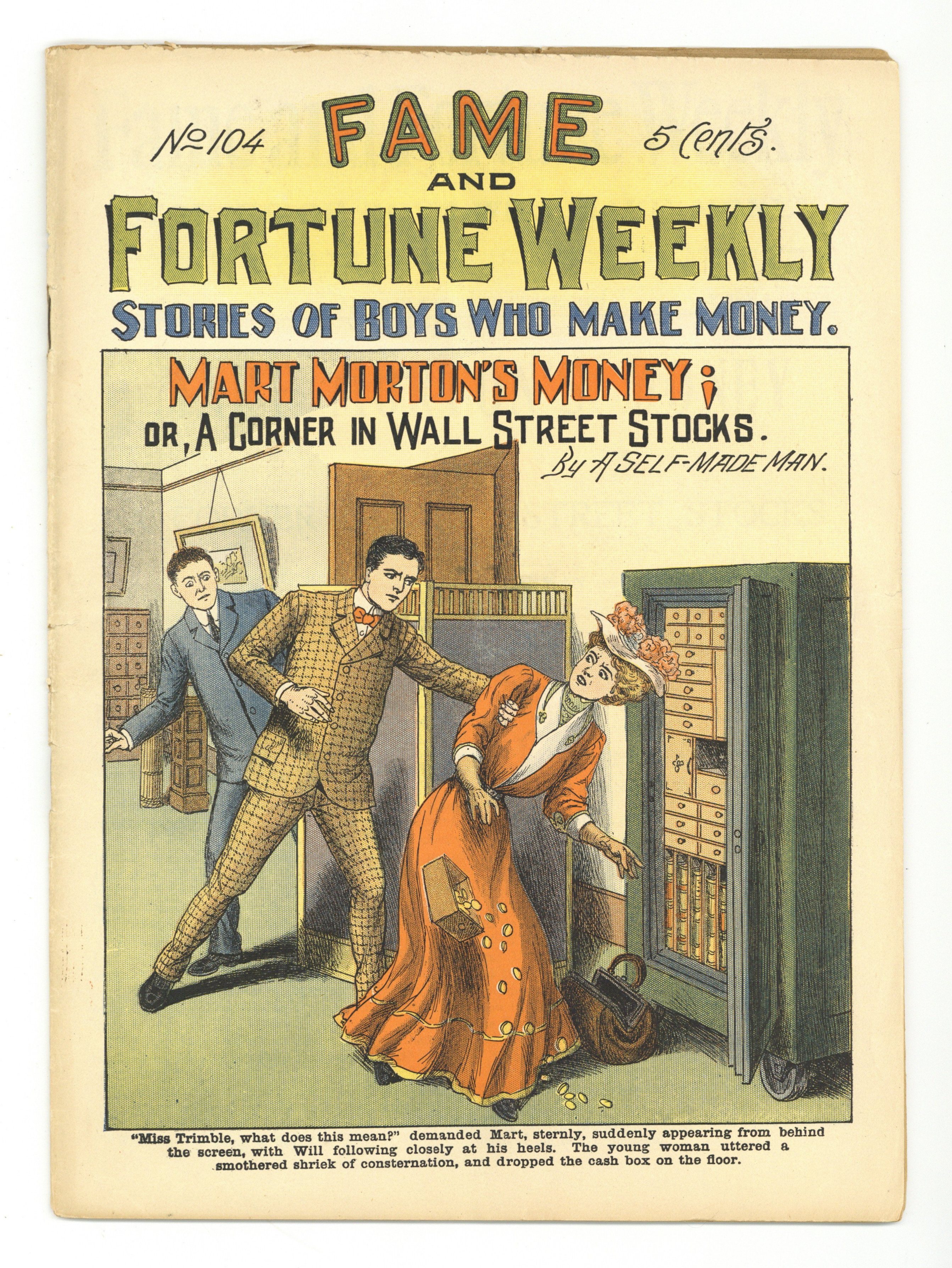 September 27, 1907. Mart Morton's Money; or, A Corner in Wall Street Stocks. 11" x 8", 36 pages. Cover price $0.05.