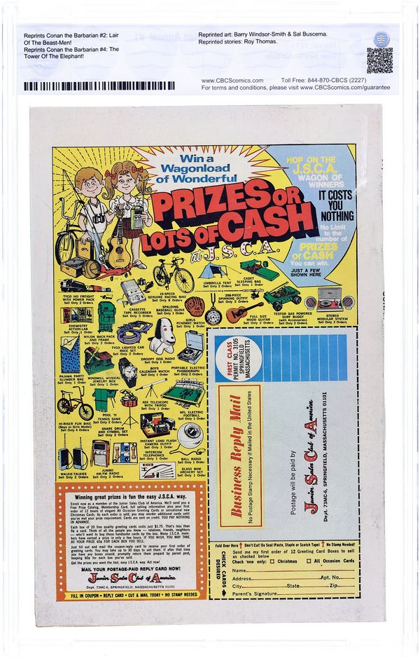 Starts Mar 23 All reprints: "Lair of the Beastmen" from Conan # 2 and "The Tower of the Elephant" from Conan # 4 (scripts by Roy Thomas, pencils by Barry Windsor-Smith, inks by Sal Buscema). Half-page Hyborian Age map by Windsor-Smith. Half-page essay noting the awards the Conan comic had won in just the first two years of its existence. New Windsor-Smith cover. 52 pgs. Cover price $0.35.
