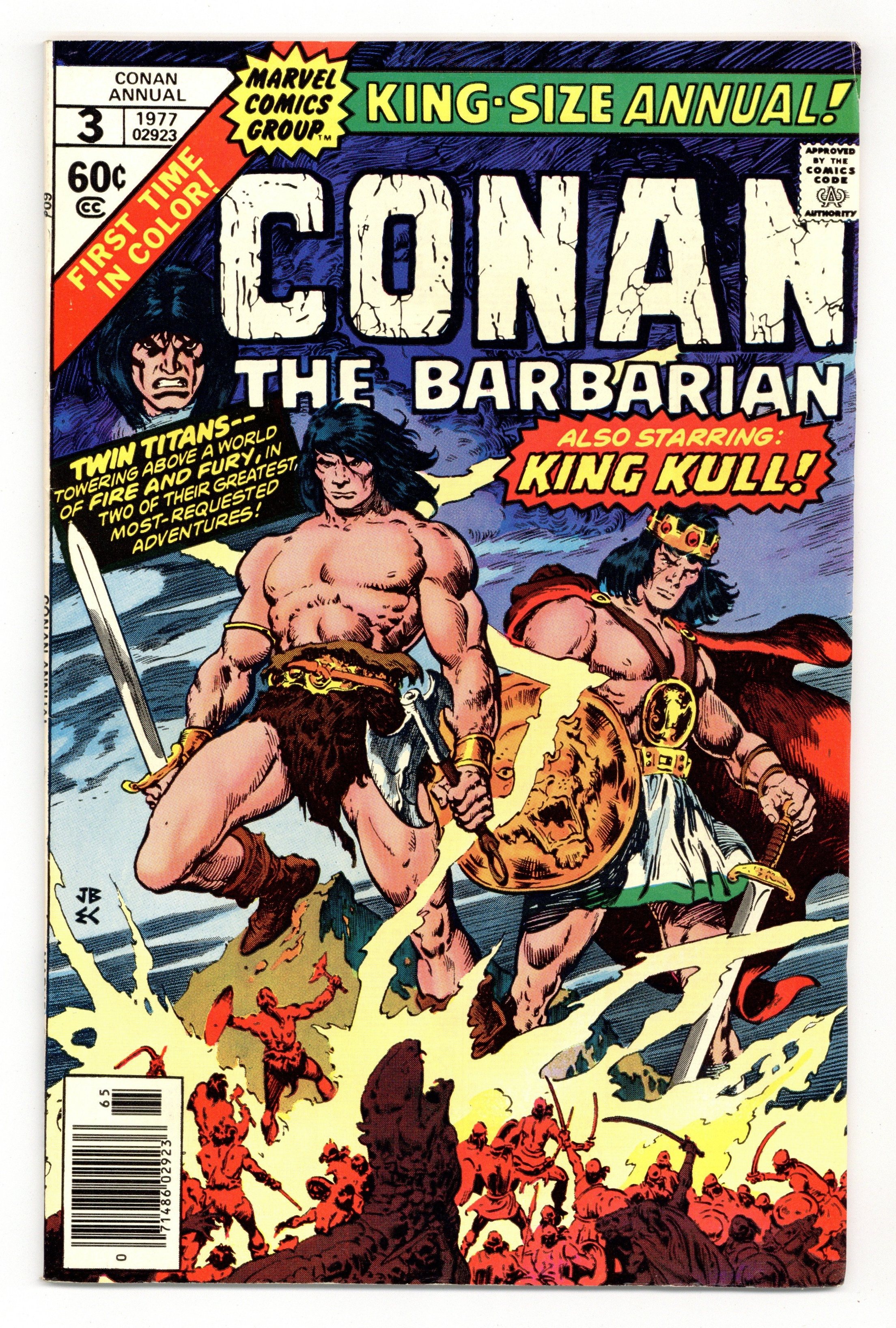 $5.40Reprints from Savage Sword of Conan: "At the Mountain of the Moon-God." Script by Roy Thomas, pencils by John Buscema, inks by Pablo Marcos. King Kull back-up: "The Beast From the Abyss." Script by Steve Englehart, pencils by Howard Chaykin, inks by the Crusty Bunkers (Neal Adams and others). Adapted from the story "Black Abyss" by Robert E. Howard and Lin Carter. Splash page inks by Rudy Nebres. New cover: John Buscema pencils, Ernie Chan inks. 52 pgs. Cover price $0.60.