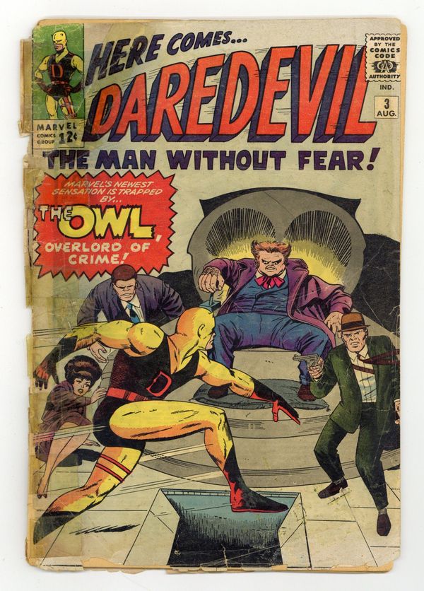 Cover pencils by Jack Kirby, inks by Vince Colletta. Origin and first appearance of the Owl inThe Owl, Ominous Overlord of Crime!, script by Stan Lee, pencils by Joe Orlando, inks by Vince Colletta; A wealthy and ruthless financier is exposed as a criminal and begins his reign as the Owl; The Owl hires Matt Murdock to get him out of his legal troubles; The Owl gathers a gang, traps DD and Karen and begins his bid to rule the underworld; DD escapes and takes the Owl down. 36 pgs. Cover price $0.12. Cover price $0.12.