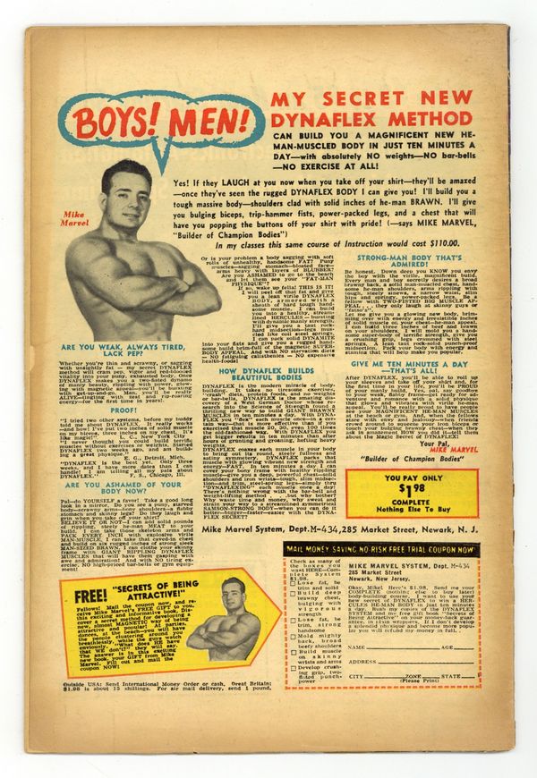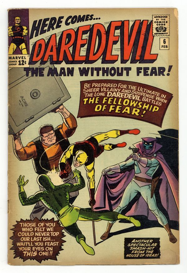 Cover art by Wally Wood. First appearance of Mr. Fear in "Trapped by the Fellowship of Fear!" Script by Stan Lee, art by Wally Wood. The Fellowship of Fear includes Mr. Fear, the Ox, and the Eel. Cameos (Mr. Fear's sculptures) by Captain America, Electro, the Owl, Rama-Tut, Mysterio, Spider-Man, the Chameleon, Dr. Doom, the Hatemonger, Diablo, the Beetle, Kraven, Baron Zemo, Iron Man, the Toad, Mr. Doll, the Black Knight, Egghead, the Hulk, the Melter, Cyclops, the Vulture, the Thing (of the Fantastic Four), Dr. Octopus, Dr. Strange, Loki, Thor, the Super Skrull, the Cobra, Magneto, Giant Man, and the Green Goblin!; DD intrudes on a phony movie shoot where the Fellowship of Fear is robbing a bank and gets himself blasted by fear gas; Mr. Fear decides to flush DD out by creating a wax figure of Hornhead for his museum; DD and Foggy both get in a brawl with the Fellowship, and Foggy is injured; DD returns to the wax museum to put an end to the Fellowship. 36 pgs. Cover price $0.12. Cover price $0.12.