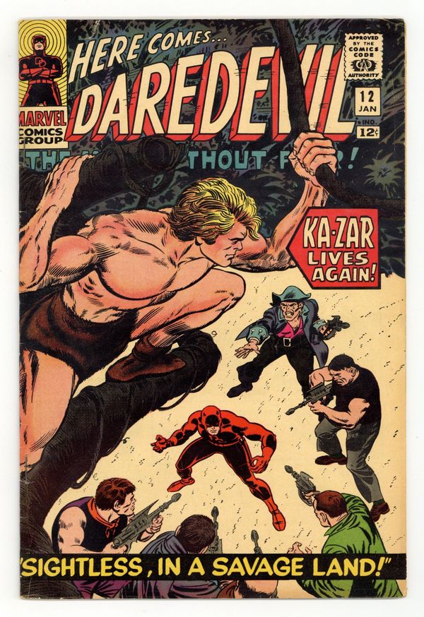 "Sightless, in a Savage Land!" Written by Stan Lee. Pencils byJack Kirby. Inks by John Romita Sr (1st comic work) Cover pencils by John Romita and Jack Kirby (Ka-Zar figure), inks by Vince Colletta and John Romita (retouches). Guest-starring Ka-Zar. Matt decides to take a cruise to get his mind off of Karen. After his cruise ship is boarded by pirates, DD is taken to the Savage Land by the Plunderer. Ka-Zar attacks the Plunderer for trespassing on his domain and saves Daredevil's life as his costume reminds the savage lord of his encounter with the X-Men. Cameos by the Sub-Mariner, the Organizer, Mr. Fear, Ape Man, Bird Man, Cat Man, Frog Man, Stilt-Man, the Matador, and the Owl. Note: First appearance of the Plunderer. Cover price $0.12.