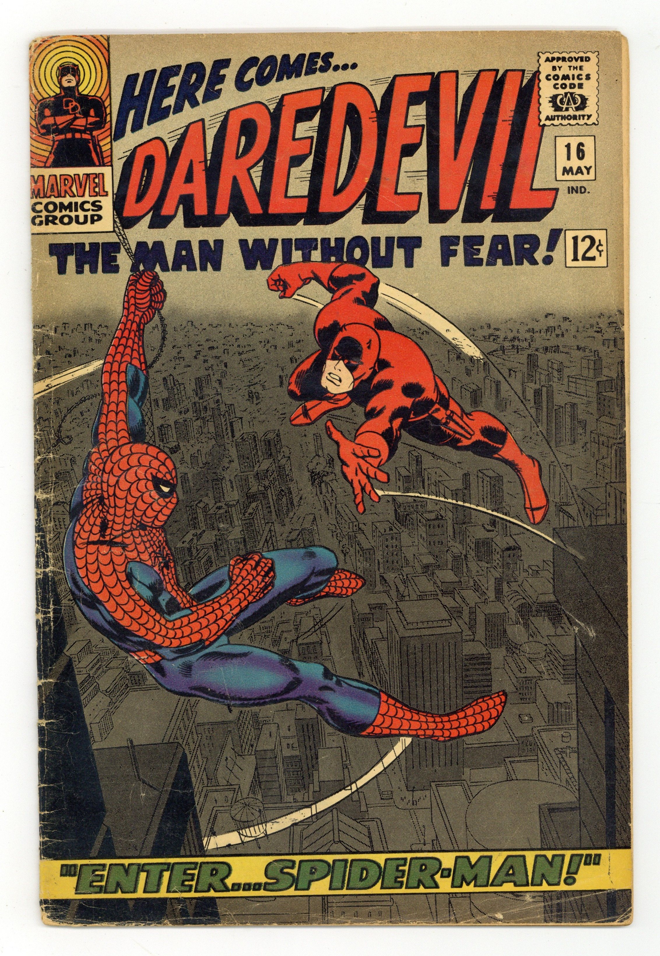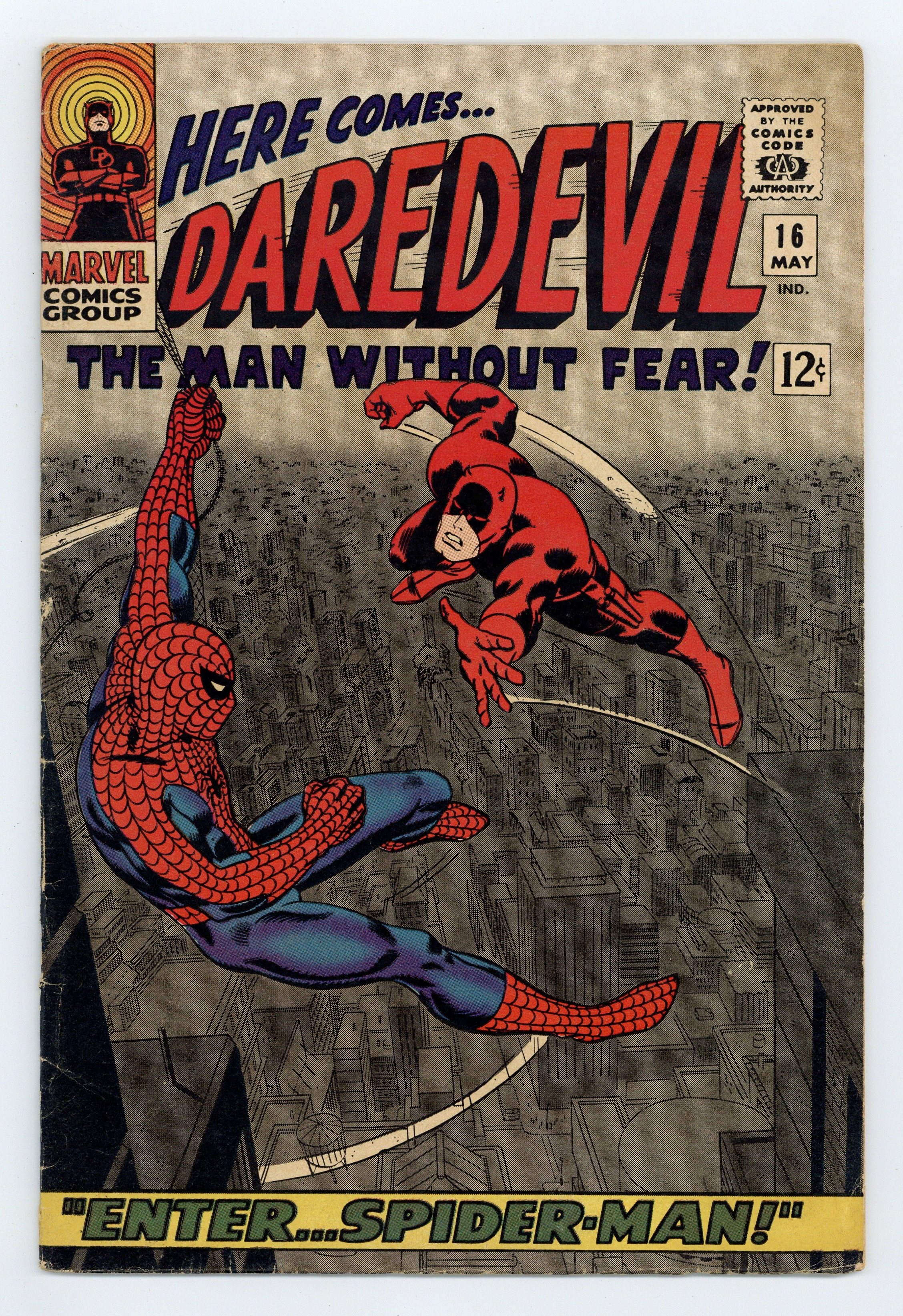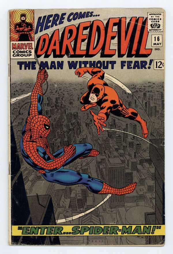 Cover pencils by John Romita, inks by Frank Giacoia. Spider-Man guest stars in Enter Spider-Man!, script by Stan Lee, pencils by John Romita Sr., inks by Frank Giacoia (as "Frank Ray"); The Masked Marauder comes up with a plan to pit Spidey and DD against each other while he makes off with an experimental engine; First appearance of the Masked Marauder. Letter to the editor from comics retailer Bud Plant. 36 pgs. 36 pgs. Cover price $0.12. Cover price $0.12.