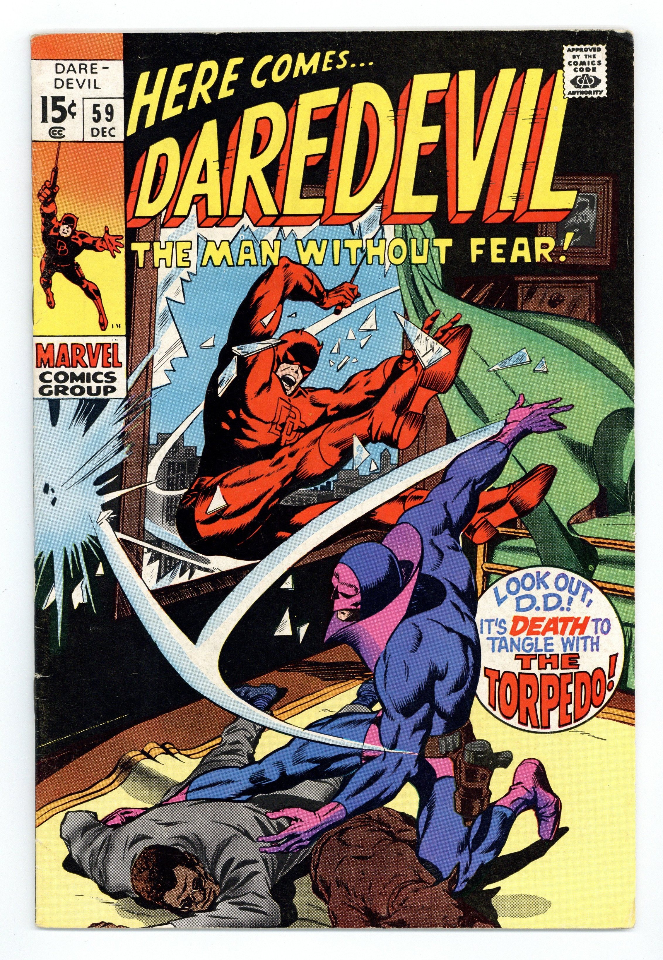 Tags: Marvel Legacy Numbering: Daredevil (part 59), Daredevil$18.25Cover pencils by Gene Colan, inks by Syd Shores. The Torpedo Will Get You If You Don't Watch Out!, script by Roy Thomas, pencils by Gene Colan, inks by Syd Shores; After Willie accidentally discovers his secret lair, Crime-Wave (first appearance) sends Torpedo (first appearance) to kill him, but DD steps in to save his old friend. 36 pgs. Cover price $0.15. Cover price $0.15.