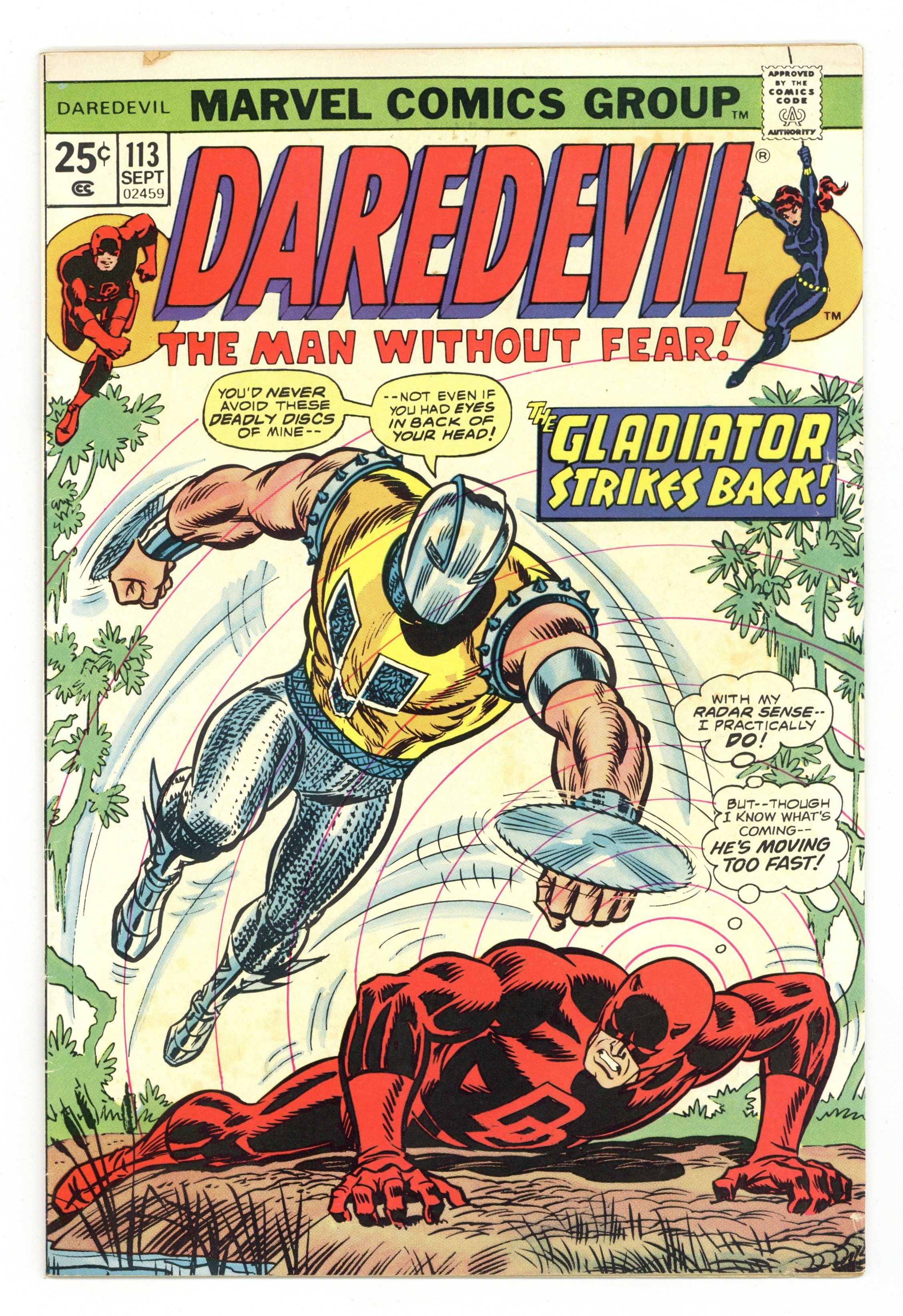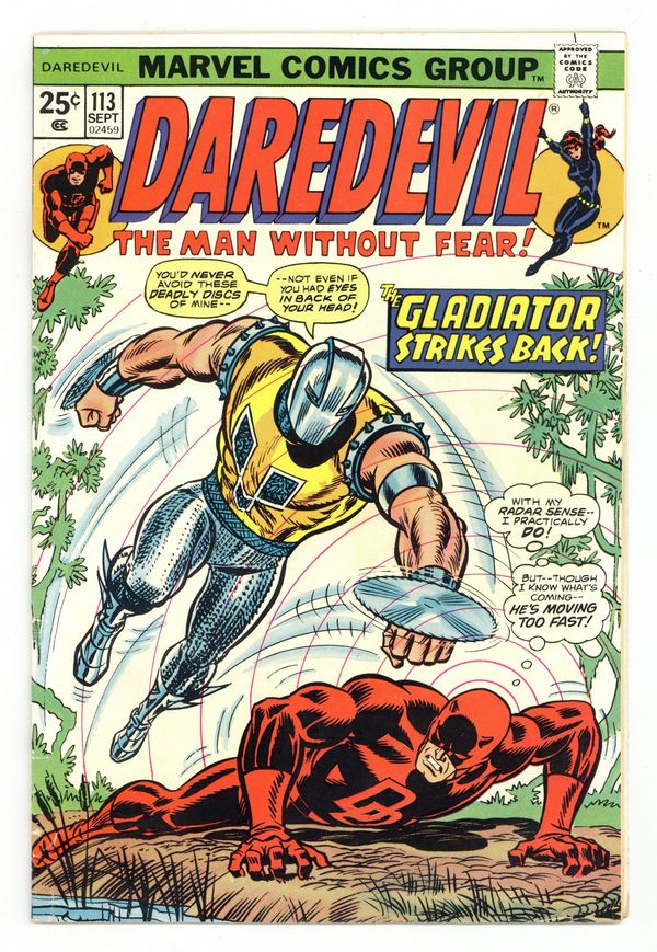$16.00First appearance of Death-Stalker (cameo). Cover pencils by John Romita, inks by John Romita and Frank Giacoia. When Strikes the Gladiator!, script by Steve Gerber, pencils by Bob Brown, inks by Vince Colletta; The Gladiator kidnaps Candice Nelson for doing a story on work by Ted Sallis; DD heads to the Florida Everglades looking for Ted and runs across the Gladiator who got there first. Appearances by the Black Widow and Shanna the She-Devil. The letters page contains Marvel Value Stamp series A #85 (Lilith, Dracula's Daughter by John Romita Sr.). 36 pgs. Cover price $0.25. Cover price $0.25.