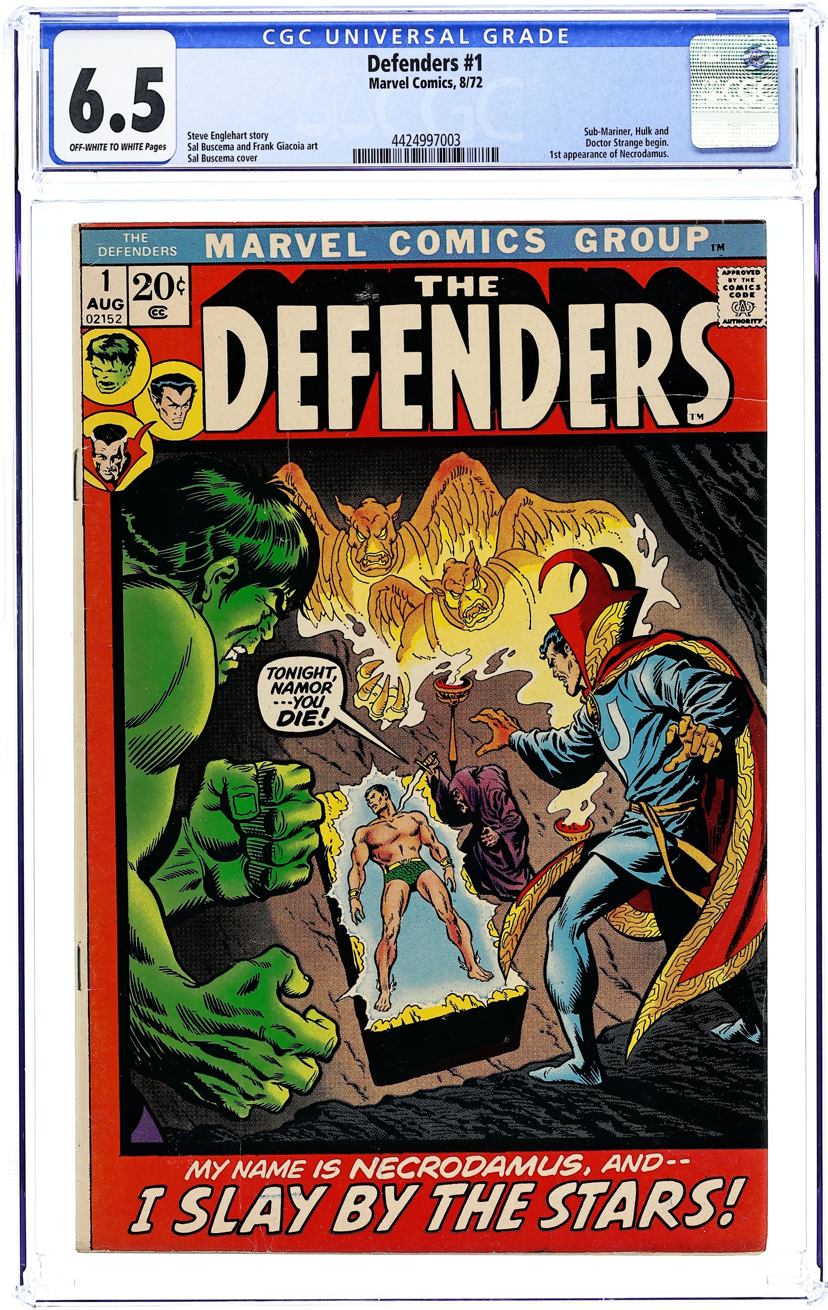 Hulk, Dr. Strange, and Sub-Mariner begin. See Marvel Feature for first Defenders. Also see Sub-Mariner # 34 & 35. Cover pencils by Sal Buscema, inks by Jim Mooney. I Slay By The Stars, script by Steve Englehart, pencils by Sal Buscema, inks by Frank Giacoia; Necrodamus attempts to sacrifice Namor to The Nameless One; Omegatron starts its countdown again. 36 pgs. $0.20. Cover price $0.20.