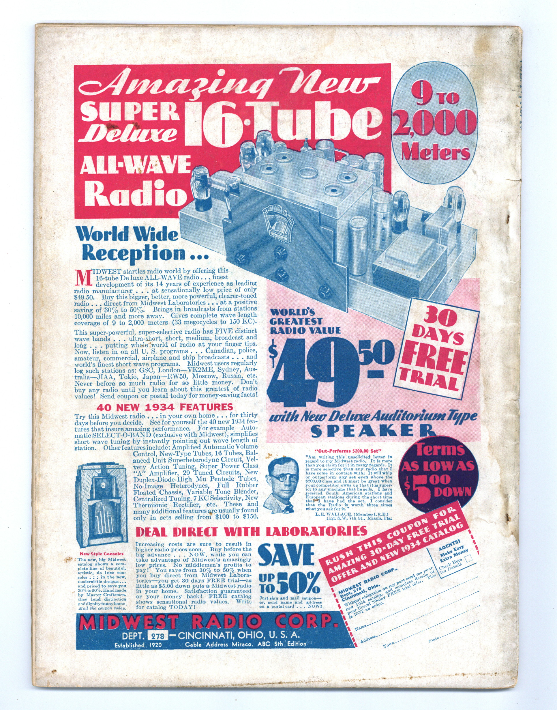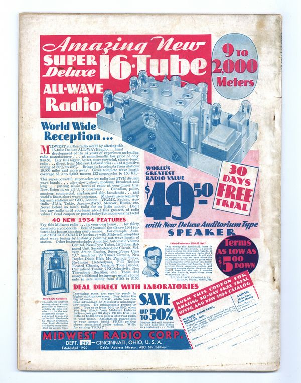 Published Oct 1933 by Continental.$18.00- Front cover detached 5%. Back cover detached 30%. Staple rust: Moderate.