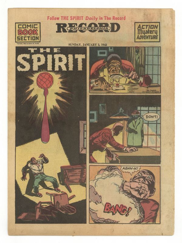 Published Jan 1943 by Promotional.$50.00Spirit Weekly Newspaper Comic Insert. 7-1/2 x 10 inches, 16 pages, full color, all newsprint with no slick cover. Eisner scripts/layouts, Fine pencils, Quality staff inks.