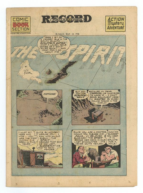 Spirit Weekly Newspaper Comic Insert. 7-1/2 x 10 inches, 16 pages, full color, all newsprint with no slick cover. Scripts/layouts by Eisner, Eisner/Nordling, Eisner/Mercer, or Spranger/Eisner; inks by Eisner or Eisner/Spranger. Lady Luck by Fred Schwab. 2nd Mr. Carrion appearance.