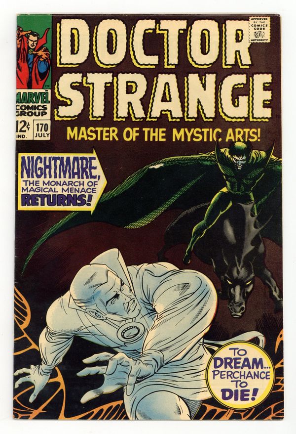 Tags: Marvel Legacy Numbering: Doctor Strange (part 170)$54.00Cover art by Dan Adkins. To Dream-- Perchance to Die!, script by Roy Thomas, art by Dan Adkins; Dr. Strange battles against Nightmare within the mind of the Ancient One. 32 pgs. $0.12. Cover price $0.12.