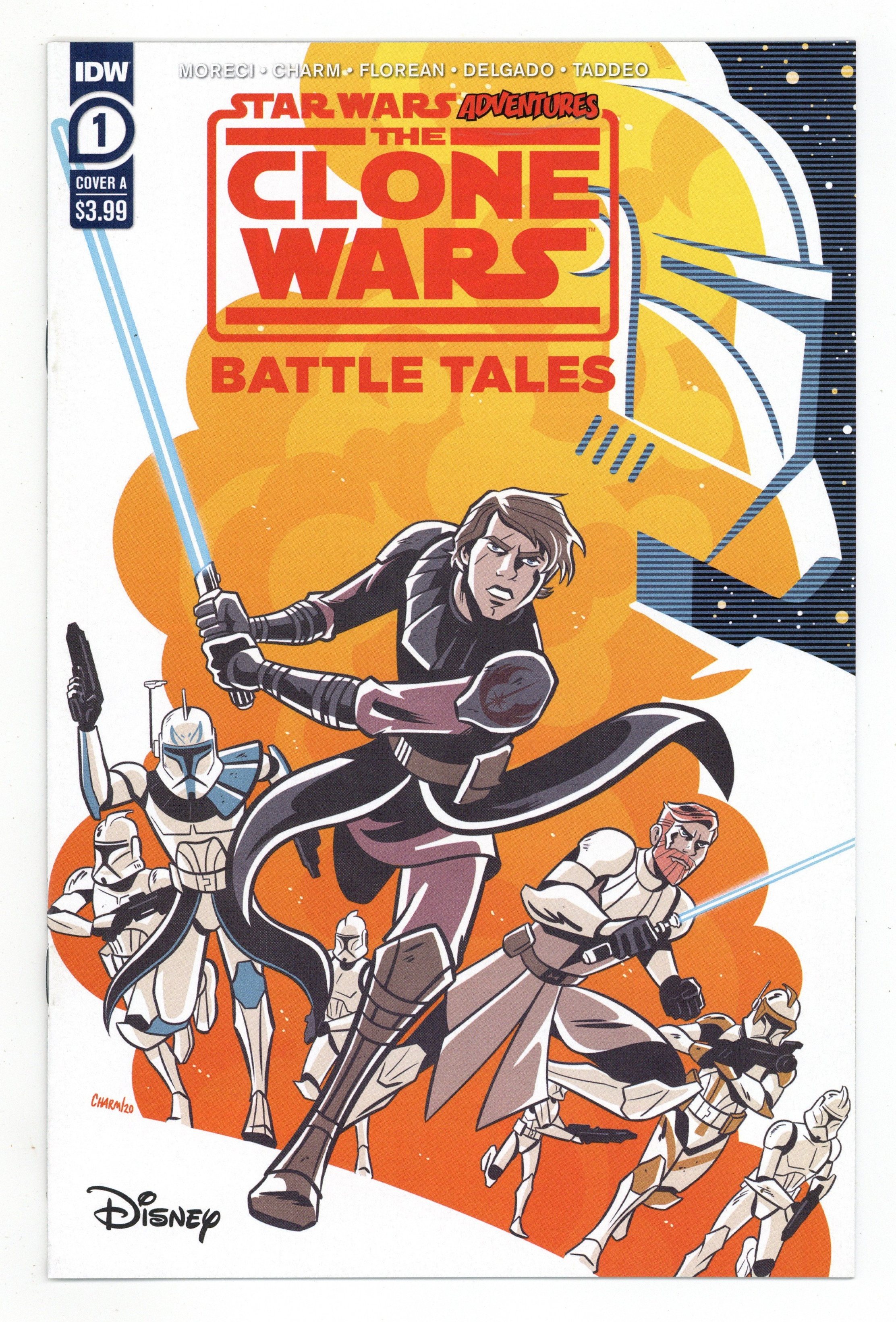 Tags: Star WarsPublished Apr 2020 by IDW Publishing.$11.00Cover by Derek Charm. Battle Tales: Chapter 1 - Written by Michael Moreci. Art by Derek Charm (pages 1-5, 19-20) and Arianna Florean/Mario del Pennino (pages 6-18). This exciting series explores a time of great upheaval in the galaxy: the Clone Wars! While Obi-Wan Kenobi, Anakin Skywalker and other Jedi Knights fight against incredible odds, Commander Cody, Captain Rex and other clones, pinned down for the duration, swap war stories that feature your favorite characters from The Clone Wars animated series! In this issue: A planet under siege! The Separatists continue their march across the galaxy, fueling the flames of war. Determined to prevent another system from falling into the Separatists' grasp, the Jedi Council sends three of its most trusted Jedi and their clone battalions to stop the enemy in its tracks... 28 pages, full color. Cover price $3.99.