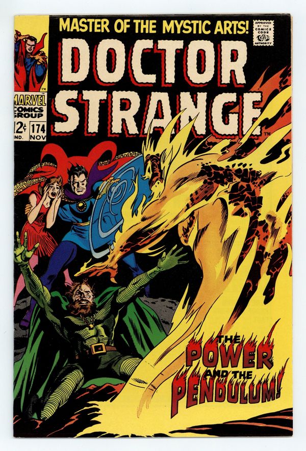 Cover pencils by Gene Colan, inks by Tom Palmer. The Power and the Pendulum, script by Roy Thomas, pencils by Gene Colan, inks by Tom Palmer; Strange battles Lord Nekron, who has made a bargain with Supreme Satannish for eternal fame and immortal life, provided he finds a mystic to take his place within one year; Strange makes time go faster and Satannish claims Nekron; First appearance of the Supreme Satannish (only hinted at previously); Clea appearance. 36 pgs. $0.12. Cover price $0.12.