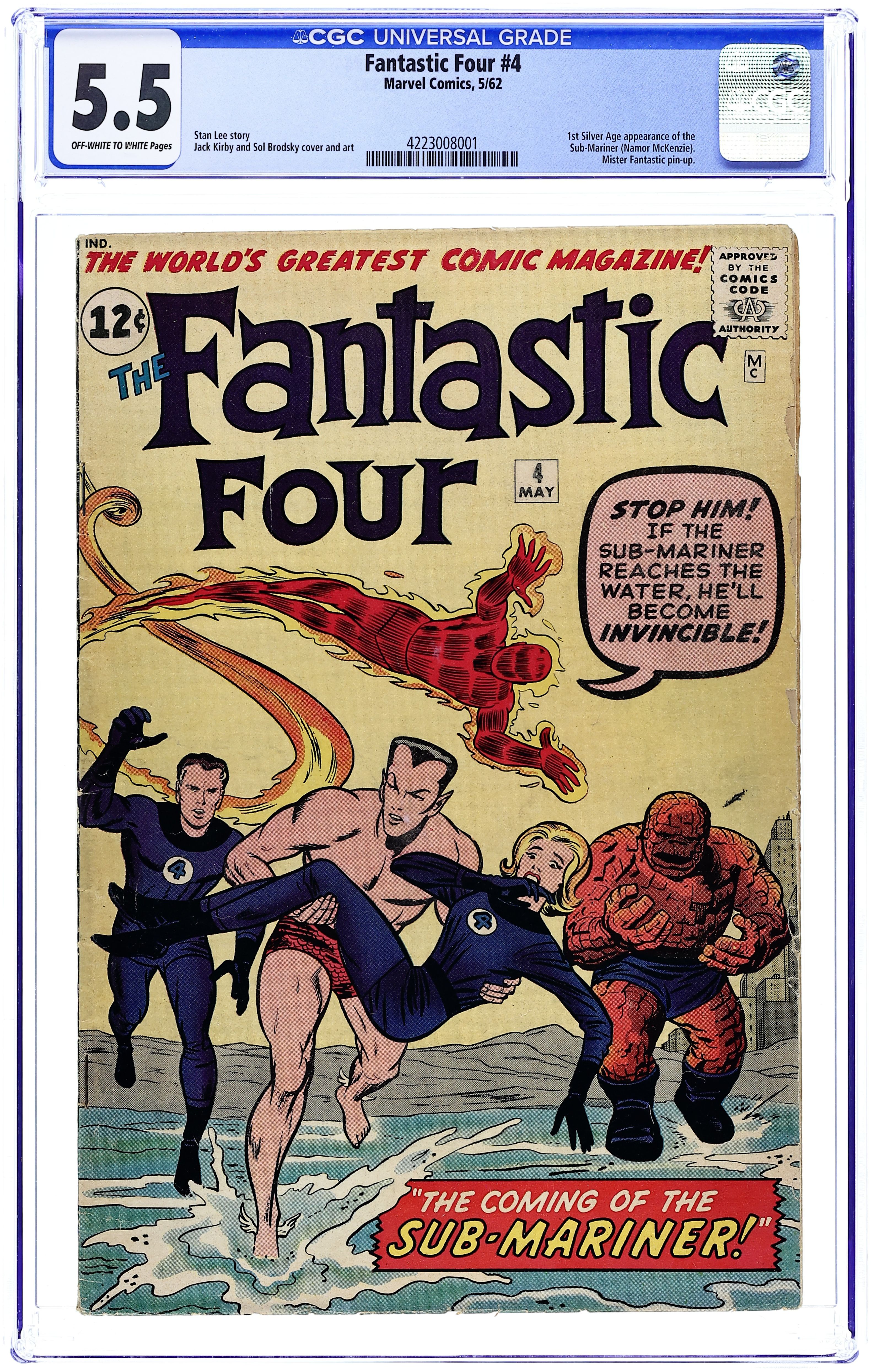 Cover pencils by Jack Kirby, inks by Sol Brodsky. First Silver Age appearance of the Sub-Mariner in The Coming of... Sub-Mariner! Chapter 1 On the Trail of the Torch!, script by Stan Lee, pencils by Jack Kirby, inks by Sol Brodsky; The Fantastic Four is searching for the runaway Human Torch. Chapter 2 Enter the Sub-Mariner!; Fleeing the Thing, the runaway Human Torch finds the amnesiac Sub-Mariner. Chapter 3 Let the World Beware!; The Human Torch drops the Sub-Mariner into the sea and he regains his memory. Chapter 4 Sub-Mariner's Revenge!; The Sub-Mariner sends Giganto to smash New York. The Fantastic Four Pin-Up Page, pencils by Jack Kirby, inks by Sol Brodsky. Chapter 5 Return to the Deep! 36 pgs. $0.12. Cover price $0.12.