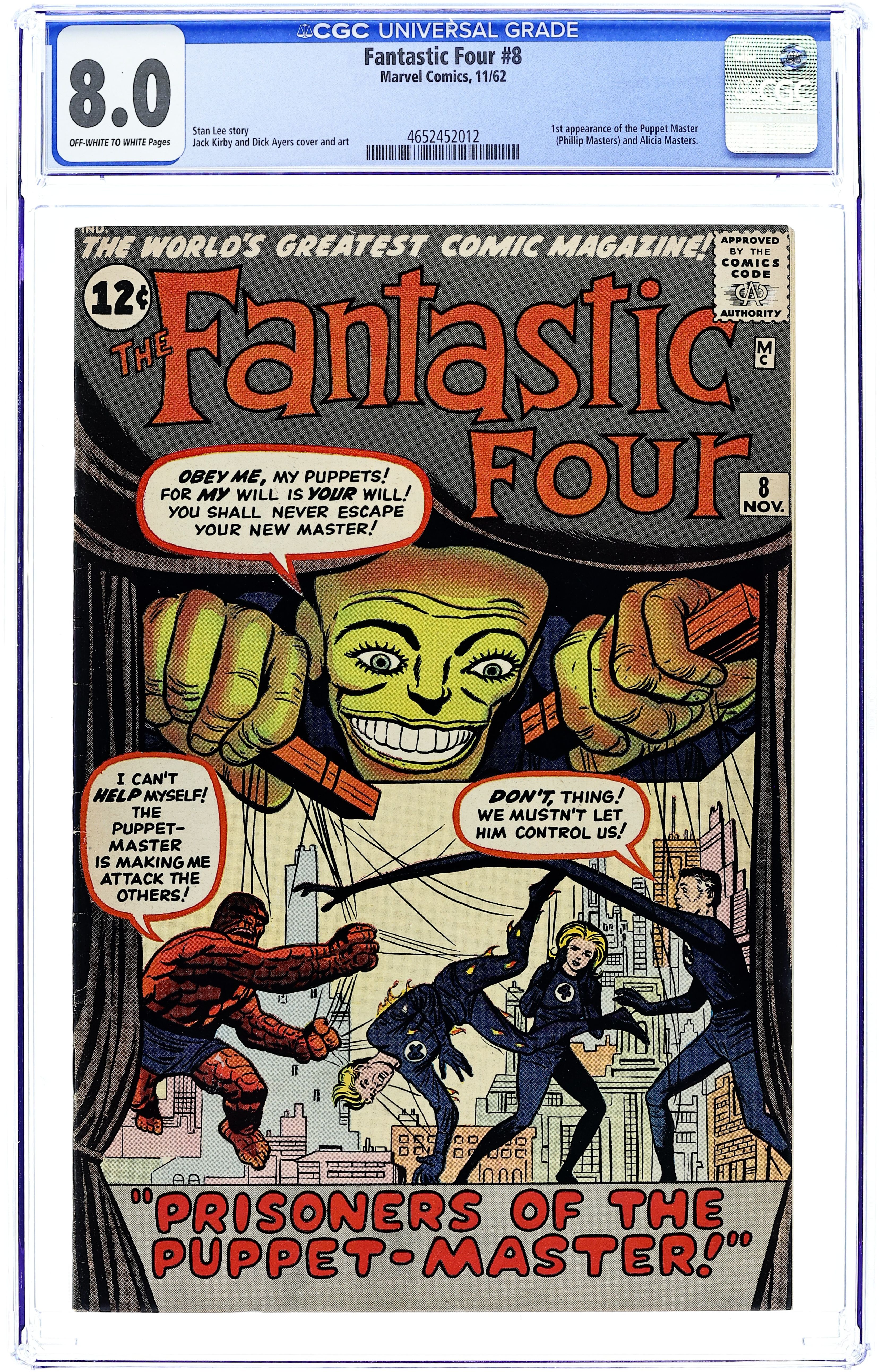 Cover pencils by Jack Kirby, inks by Dick Ayers. First appearance of Puppet Master and Alicia Masters in "Prisoners of the Puppet Master!" (making this the fourth issue in a row that has either "prisoners" or "captives" in the title!), script by Stan Lee, pencils by Jack Kirby, inks by Dick Ayers; The Puppet Master tests his radioactive clay that gives him the power to remotely control people that are modeled in the clay. The Human Torch character profile. "The Hands of the Puppet Maker" Part 2; The Puppet Master gets the Thing under his command and imprisons the Invisible Girl; He then sends the Thing and Alicia Masters to infiltrate the Baxter Building. "The Lady and the Monster!" Part 3; While acting under the Puppet Master's influence, the Thing is subjected to one of Mister Fantastic's potions that changes him back to Ben Grimm. "Face-to-face with the Puppet Master!" Part 4; The Puppet Master stages a jailbreak just to prove his might. Death of a Puppet! Part 5; The jail break is stopped by the Fantastic Four and the Puppet Master falls to what seems to be his death. 36 pgs. $0.12. Cover price $0.12.