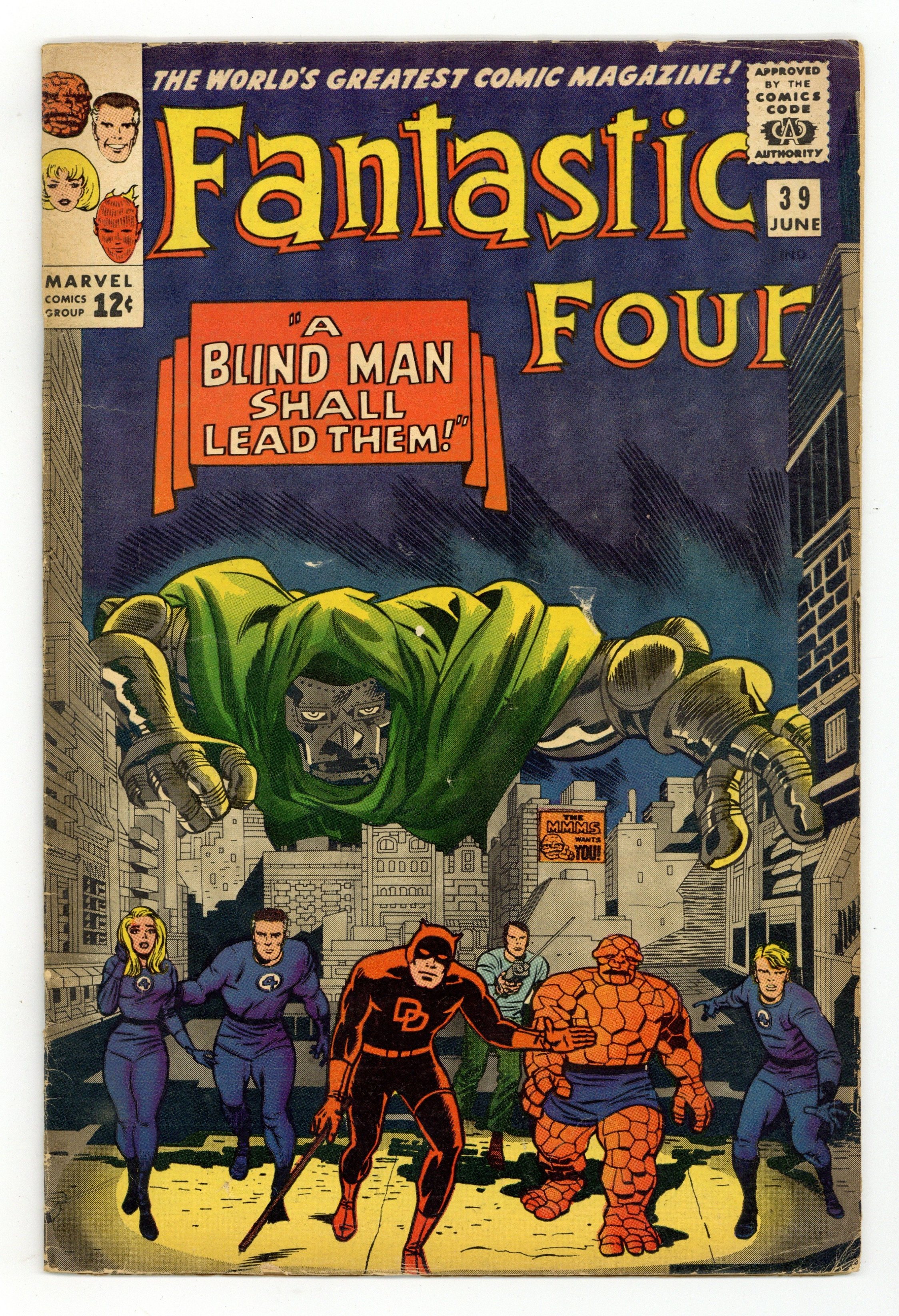 Cover pencils by Jack Kirby, inks by Chic Stone and Wally Wood (on Daredevil figure). A Blind Man Shall Lead Them!, script by Stan Lee, pencils by Jack Kirby, inks by Frank Giacoia [as Frank Ray] and Wally Wood (Matt Murdock and Daredevil figures); Reed devises mechanical devices to enable the FF to duplicate their vanished super-powers; Matt Murdoch visits the FF and Dr. Doom attacks; Daredevil assists the FF in battling Doom. Cameos by Medusa, the Wizard, the Sandman, and the Trapster. 36 pgs. $0.12. Cover price $0.12.