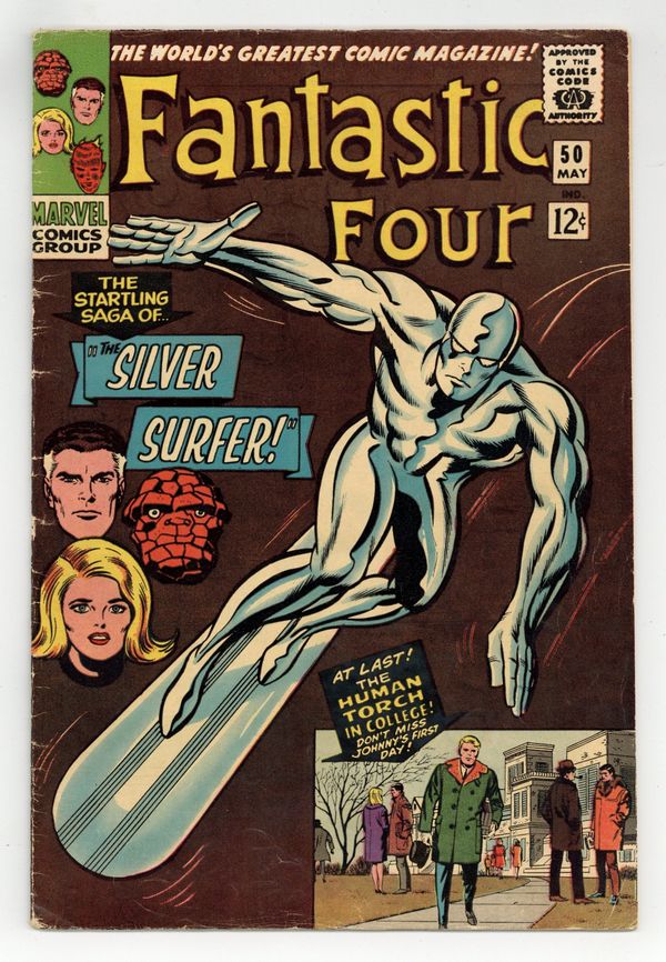 Cover pencils by Jack Kirby, inks by Joe Sinnott. Galactus battles the Silver Surfer in the conclusion of the Galactus Trilogy, The Startling Saga of the Silver Surfer!, script by Stan Lee, pencils by Jack Kirby, inks by Joe Sinnott; With the aid of the Silver Surfer, the Fantastic Four force Galactus to leave Earth; Johnny Storm begins to attend Metro College and meets Wyatt Wingfoot. Watcher and Inhumans appearances. First appearance of Wyatt Wingfoot. Letter to the editor from comics writer Gerry Conway. 36 pgs. $0.12. Cover price $0.12.