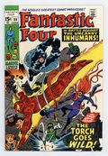 "The Torch Goes Wild!" Guest-starring the Inhumans. Script by Stan Lee. Pencils by Jack Kirby. Inks by Joe Sinnott. Cover by Jack Kirby and John Verpoorten. The fighting mad Human Torch invades the Hidden Land! And Johnny Storm has just one goal in mind! Reunite with his beloved Crystal and bring her back home to New York City! However Black Bolt and the royal family disagree. So the Human Torch must fight to get what he wants! After Johnny battles past Triton, Karnak, and Medusa; only one inhuman stands in his way! Crystal herself! But wait a minute, the plan was to save Crystal, not fight her! The torch's road to Attilan was paved with good intentions, but now it's turning into a disaster! Can Reed, Sue, and Ben get their youngest teammate under control before he destroys the Inhumans' homeland? Cameo appearance by Gorgon. (Notes: Johnny Storm returns to the Great Refuge (again looking for Crystal) in Fantastic Four 130. This issue includes a half-page survey for readers to complete and mail back to the Marvel bullpen. This story was reprinted in Marvel's Greatest Comics 80.) 36 pages Cover price $0.15.