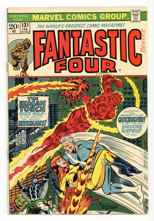 "Revolt in Paradise!" Part 1 of 2. Guest-starring Quicksilver and the Inhumans. Script by Roy Thomas. Pencils by Ross Andru. Inks by Joe Sinnott. Cover by Jim Steranko and Joe Sinnott. A fighting mad Human Torch busts into the Great Refuge's barricaded tower looking for Crystal! Johnny Storm finds her all right...and then finds the biggest shock of his life: Quicksilver! What is the mutant speedster doing in Attilan? And in the company of Crystal? Cooler heads don't prevail, and suddenly it's the Human Torch vs. Quicksilver! But a powerful earthquake rocks Attilan and halts the heroes fight! The Inhumans proceed to round up the usual suspect, Maximus, and press him for answers. But Black Bolt's brother doesn't seem to be the enemy this time...it's the Alpha Primitives and Omega! Flashback cameos by Larry Trask and the Sentinels. (Notes: Roy Thomas' bringing together of Crystal and Pietro was a very significant event in the Marvel Universe. Their relationship would spawn many future storylines among the Avengers, Inhumans, and Fantastic Four. Quicksilver previously appeared in Avengers 104. The letters page contains letters from both comics writer Mike Barr and Charles Dixon.) 36 pages Cover price $0.20.