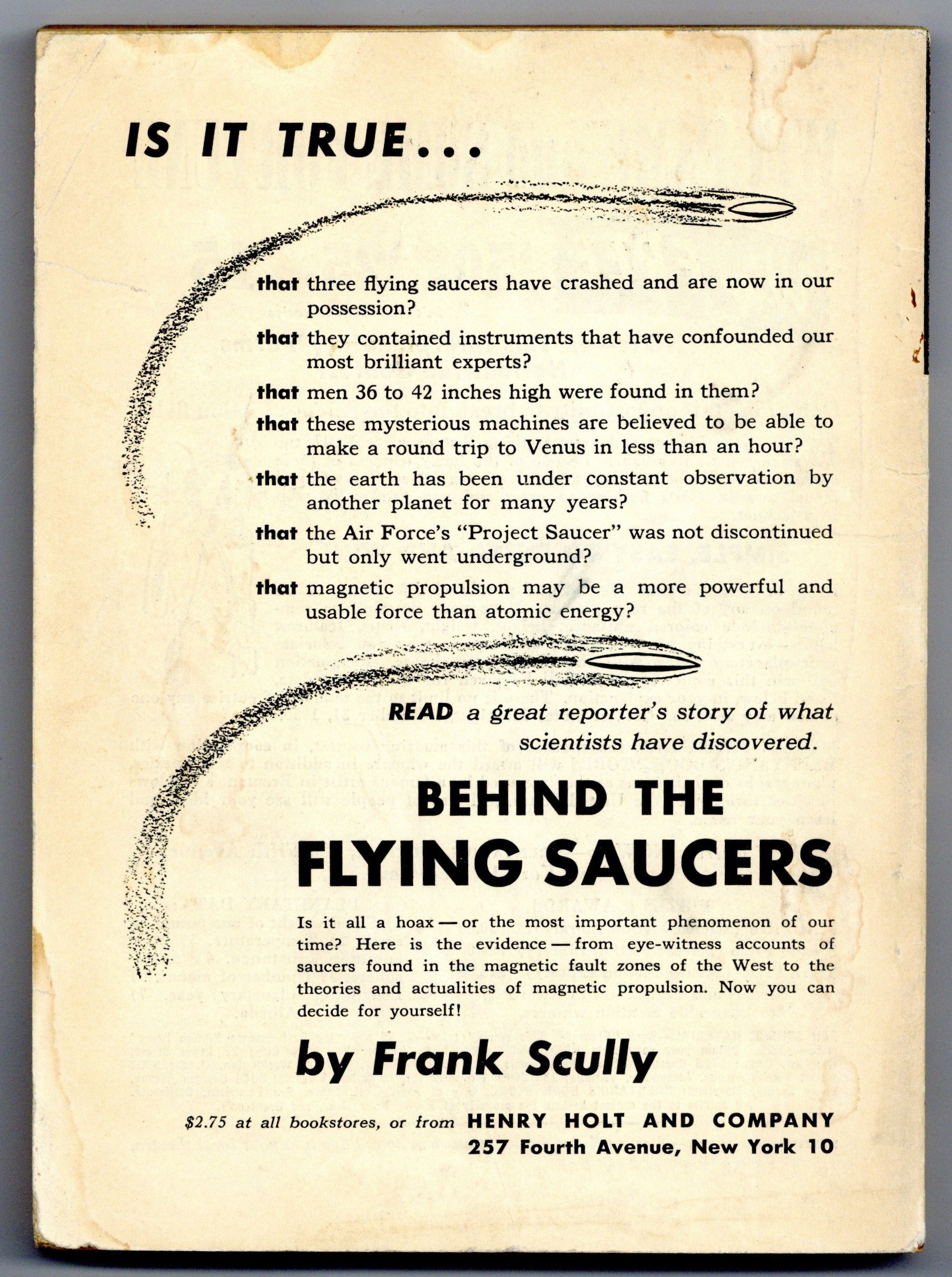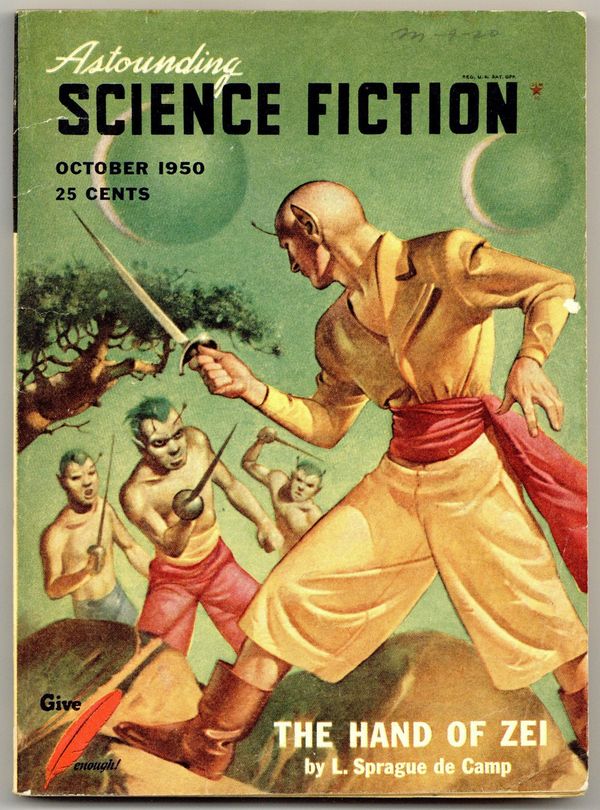 Published Oct 1950 by Street & Smith.$10.00Volume 46, Issue 2 - October, 1950. Cover by Cartier. Stories: "The Hand of Zei" (Part 1 of 4) by L. Sprague de Camp, "Discontinuity" by Raymond F. Jones, "Trigger Tide" by Norman Menosco, and "The Enchanted Forest" by Fritz Leiber. Softcover, 5.50-in x 7.75-in, 162 Pages, B&W. Cover price $0.25.