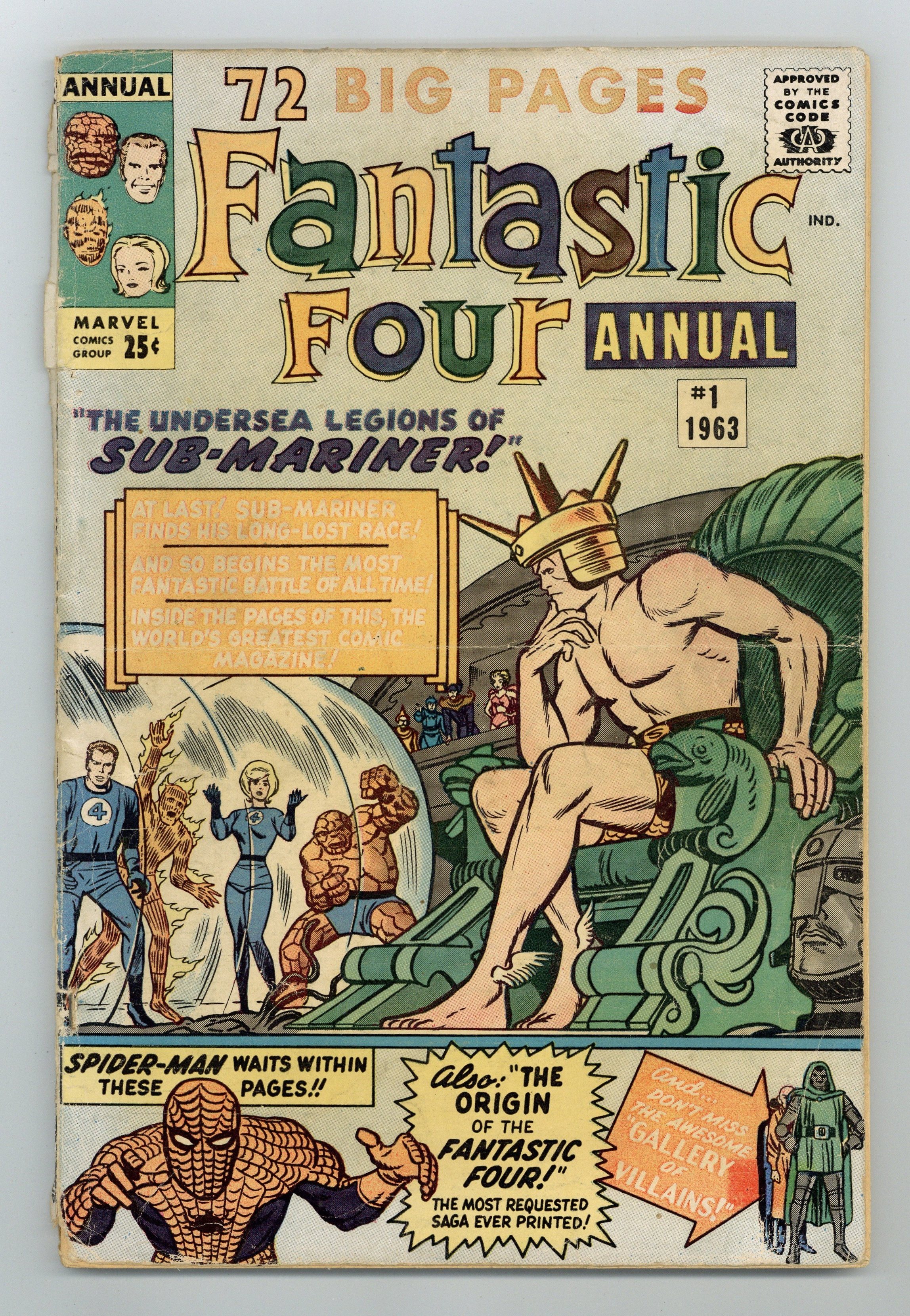 Starts Apr 4 New Sub-Mariner/FF story: "Sub-Mariner Versus the Human Race!" Script by Stan Lee; pencils by Jack Kirby; inks by Dick Ayers. New Spider-Man/FF story: "The Fabulous Fantastic Four Meet Spider-Man!" Script by Stan Lee; pencils by Kirby; inks by Steve Ditko. Fourteen pages new pin-ups and special features by Kirby/Sol Brodsky. Thirteen-page Fantastic Four origin reprinted from FF #1 76 pgs. Cover price $0.25.