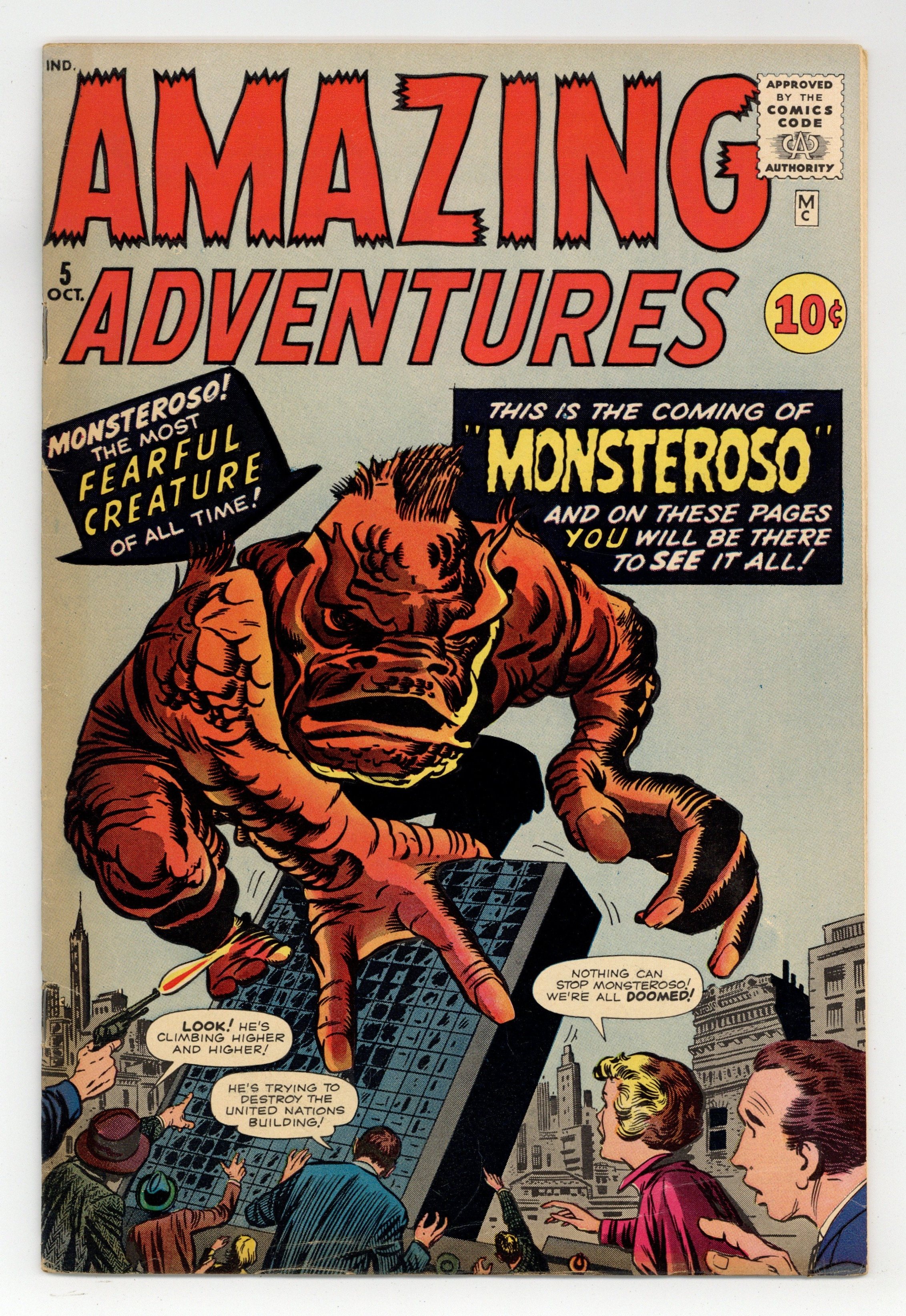 $141.00Cover pencils by Jack Kirby and Steve Ditko, inks by Dick Ayers and Steve Ditko. The Escape of...Monsteroso!, script by Stan Lee, pencils by Jack Kirby, inks by Dick Ayers; A circus owner finds a dead alien in Africa and brings it to the United States for a museum; The alien turns out to be alive, and then goes on a rampage; It turns out that it is only a confused child, and its parents arrive to retrieve it. T.V. or...? text story. The Watchers!, script by Stan Lee, art by Don Heck; A brilliant scientist believes that human ingenuity is guided by unseen advanced creatures, not knowing that his janitor is one such creature. The Joker!, script by Stan Lee, art by Steve Ditko; A practical joker thinks that aliens are his victims playing a joke on him, but they are real aliens and take him to an off world zoo. 36 pgs. $0.10. Cover price $0.10.
