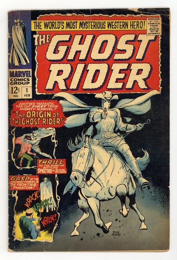 Origin and first appearance of Ghost Rider (Carter Slade) and his horse Banshee in "The Origin of the Ghost Rider," script by Gary Friedrich, Roy Thomas, and Dick Ayers (plot), pencils by Dick Ayers, inks by Vince Colletta; School teacher Carter Slade was making his way to Bison Bend, Montana, to become the teacher for the new school built by newly settled homesteaders looking to build a home. Upon his arrival, however, he witnessed an attack by Indians; Slade put up a good fight but was outnumbered; Flaming Star treated Slade's wounds and pleaded to the gods for days to spare the life of the white man; Finally, on the Eighth day, Slade awoke which prompted Flaming Star to proclaim him the chosen one that had been revealed in prophecy that would become a powerful warrior, a living legend called "He Who Rides the Night Winds." Also a 6 page Kid Colt reprint, "The Menace of the Mask Maker!", script by Stan Lee, art by Jack Keller; A mask maker frames Kid Colt for a crime; originally presented in Kid Colt Outlaw # 105 (07/1962). Cover art by Dick Ayers. 36 pgs., full color. Cover price $0.12.