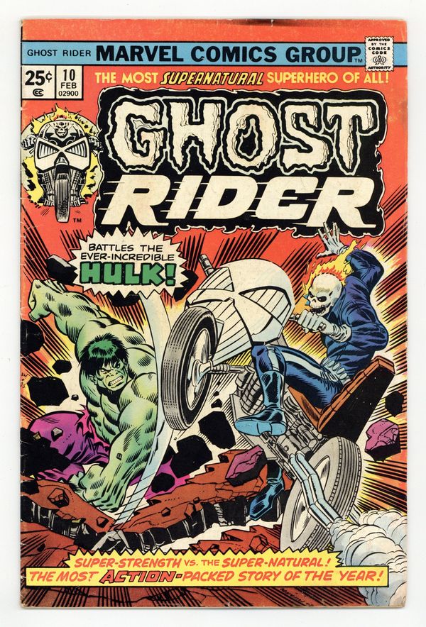 "Ghost Rider!" Story by Gary Friedrich. Art by Mike Ploog. Cover by Ron Wilson and Joe Sinnott. This issue reprints Ghost Rider's origin tale from the pages of Marvel Spotlight (1971 1st Series) #5. 32 pages, FC. NOTE: The Hulk appears on the cover but is not inside this issue. Next issue contains a note from Marvel explaining that the cover for this fill-in issue went to press before they realized the planned story was not ready yet. The Hulk does appear in Ghost Rider #11. Cover price $0.25.