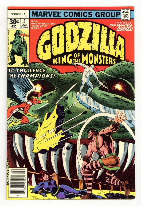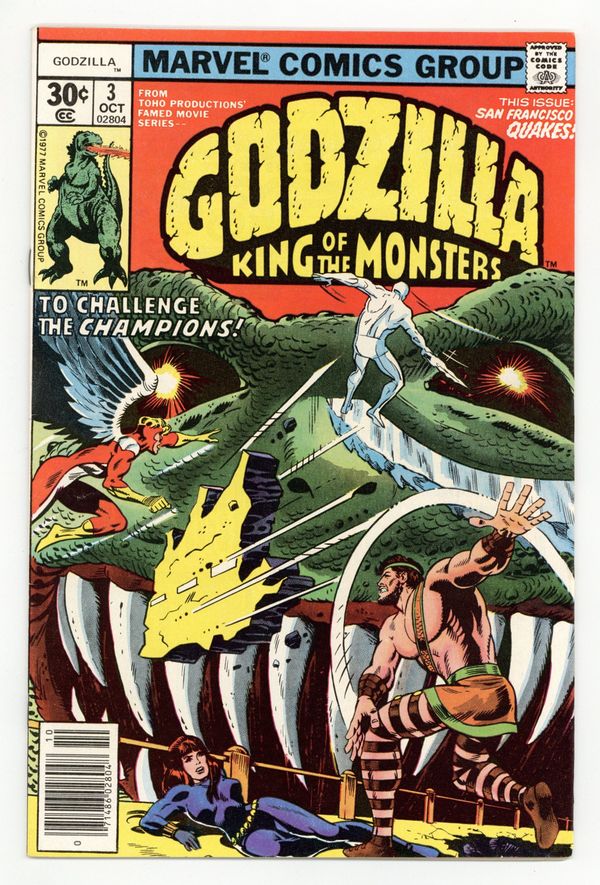 "A Tale of Two Saviors!" Guest-starring the Champions. Story by Doug Moench. Art by Herb Trimpe and Tony DeZuniga. Godzilla's west coast tour continues as the great monster arrives in world famous San Francisco Bay with S.H.I.E.L.D. in hot pursuit. But San Francisco is not without its own heroes. Hercules, Black Widow, Ice Man, and the Angel, otherwise known as the Champions, attempt to halt the King of all Monster's rampage before it is too late. Cover price $0.30.