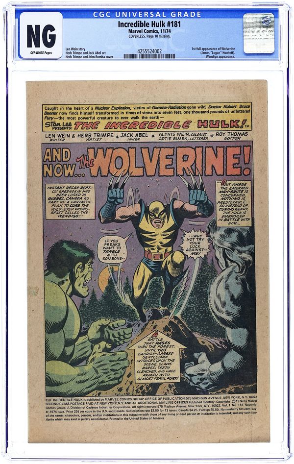 Starts Jan 3 First full Wolverine story (cameo appearance in previous issue). Cover art by Herb Trimpe. And Now...The Wolverine!, script by Len Wein, pencils by Herb Trimpe, inks by Jack Abel; Canadian super-agent Wolverine teams up with the Hulk to battle Wendigo; Once the monster is felled, however, Wolvie turns on the Hulk and the two battle; Marie goes ahead with her plans of trying to transfer the power of the Wendigo into the Hulk but when the guilt becomes too much for best friend Georges who feels responsible for Paul's monstrous condition, he works the change on himself; Paul Cartier is returned to human form and Georges becomes the Wendigo. Wendigos story continues in Monsters Unleashed 9.Marvel Value Stamp #54 (Shanna). Letter from Mary Jo Duffy. 36 pgs. $0.25. Cover price $0.25.