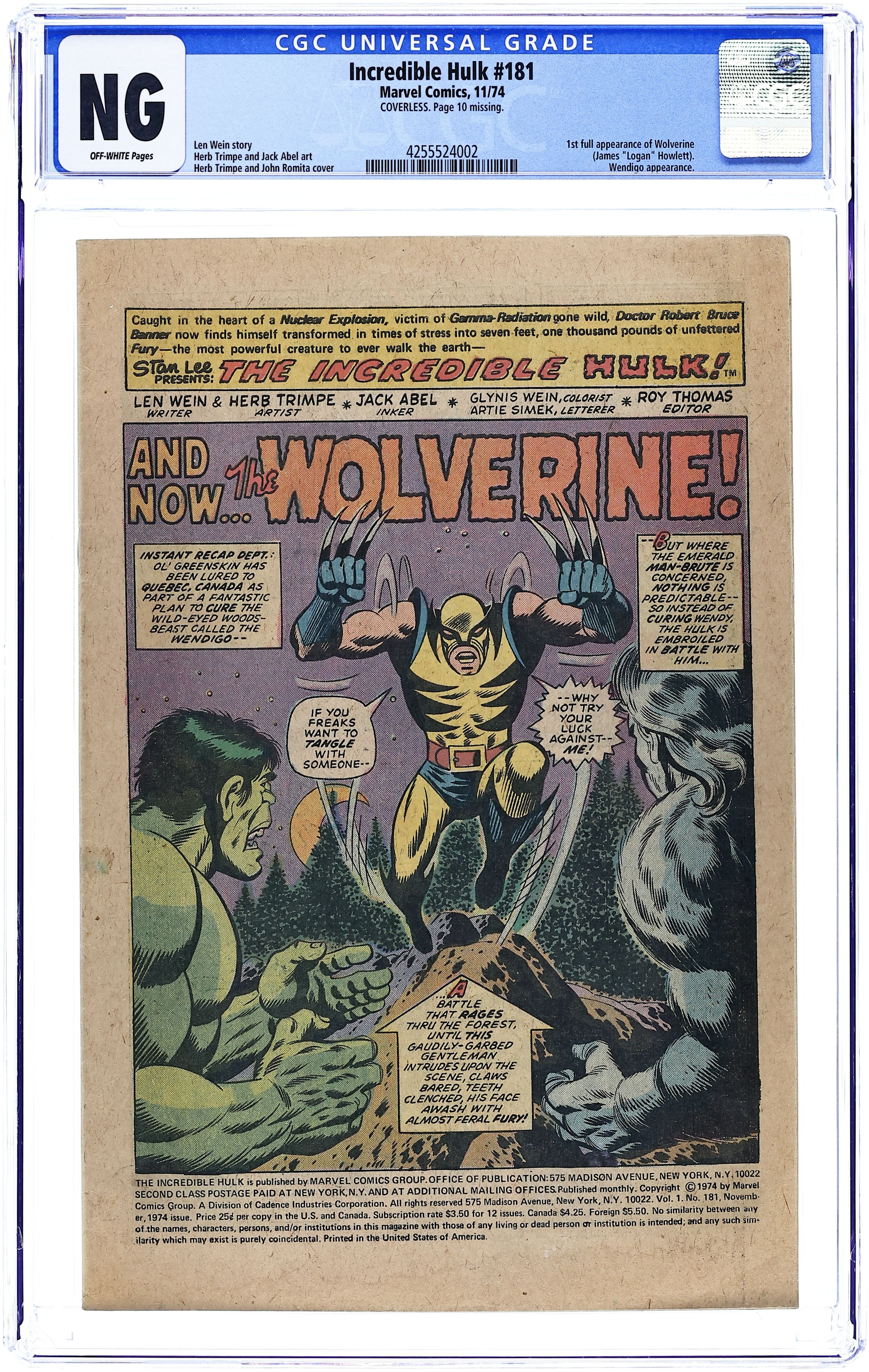 First full Wolverine story (cameo appearance in previous issue). Cover art by Herb Trimpe. And Now...The Wolverine!, script by Len Wein, pencils by Herb Trimpe, inks by Jack Abel; Canadian super-agent Wolverine teams up with the Hulk to battle Wendigo; Once the monster is felled, however, Wolvie turns on the Hulk and the two battle; Marie goes ahead with her plans of trying to transfer the power of the Wendigo into the Hulk but when the guilt becomes too much for best friend Georges who feels responsible for Paul's monstrous condition, he works the change on himself; Paul Cartier is returned to human form and Georges becomes the Wendigo. Wendigos story continues in Monsters Unleashed 9.Marvel Value Stamp #54 (Shanna). Letter from Mary Jo Duffy. 36 pgs. $0.25. Cover price $0.25.